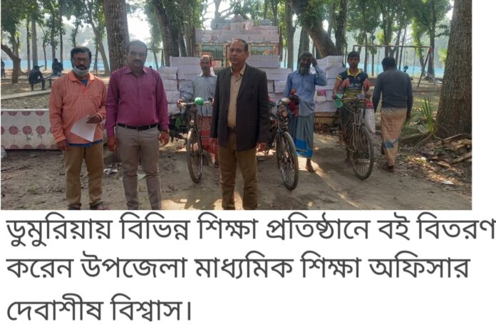 ভ্রাম্যমান প্রতিনিধি,ডুমুরিয়া (খুলনা)। খুলনার ডুমুরিয়ায় বিভিন্ন শিক্ষা প্রতিষ্ঠানে বই বিতরণ করা হয়েছে। বৃহস্পতিবার সকাল ১০ টায় উপজেলা মাধ্যমিক শিক্ষা অফিস থেকে এ বই পাঠানো হয়। এ সময় উপস্থিত ছিলেন উপজেলা মাধ্যমিক শিক্ষা অফিসার দেবাশীষ বিশ্বাস , উপজেলা একাডেমিক সুপার ভাইজার টিকেন্দনাথ সানা ও বিভিন্ন শিক্ষা প্রতিষ্ঠানের প্রধান শিক্ষকগন। এব্যাপারে উপজেলা মাধ্যমিক শিক্ষা অফিসার দেবাশীষ বিশ্বাস বলেন , ডুমুরিয়া উপজেলায় মোট ৬৭টি মাধ্যমিক বিদ্যালয় ও ৩৩ মাদ্রাসায় ইতিমধ্যে ৮০% বই পাঠানো হয়েছে। বাকী ২০% বই আগামী ১ সপ্তাহের মধ্যে পাঠানো হবে।