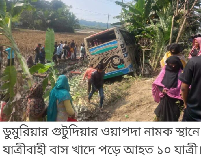 ভ্রাম্যমান প্রতিনিধি,ডুমুরিয়া (খুলনা)। খুলনার ডুমুরিয়ায় যাত্রীবাহী বাস খাদে পড়ে ১০ যাত্রী আহত হয়েছে। শুক্রবার সকাল সাড়ে এগারোটায় খুলনা সাতক্ষীরা মহাসড়কের গুটুদিয়া অবদার রাস্তা নামক স্থানে এ দুর্ঘটনা ঘটে। এলাকাবাসী ও ডুমুরিয়া ফায়ার সার্ভিস সুত্রে জানা যায়, সাতক্ষীরা থেকে ছেড়ে আসা খুলনাগামী (সাতক্ষীরা-জ-১১-০১০৯) যাত্রীবাহী বাসটি ঘটনার দিন সকালে ঘটনাস্থলে পৌঁছালে নিয়ন্ত্রণ হারিয়ে খাঁদে পড়ে বাসটি উল্টে যায়। এ সময় বাসের মধ্যে থাকা খুলনার পাটগাতি এলাকার রাবেয়া বেগম (৫০), আরনি খাতুন (১৮), সাতক্ষীরা কালিগঞ্জের সুফিয়া বেগম (৪০), শফিকুল ইসলাম (৩৫), যশোর মোল্লাপাড়ার আসাদুল ইসলাম (৪০), ডুমুরিয়া খলসির মনিরুল ইসলাম (৬০), চুকনগরের মাসুম বিল্লাহ, পলি বেগম (৩৯), মহিবা বেগম (৩৬), ও জোহানি খাতুন (৭) আহত হন। খবর পেয়ে ডুমুরিয়া ফায়ার সার্ভিস দ্রুত ঘটনাস্থলে গিয়ে তাদেরকে উদ্ধার করে ডুমুরিয়া স্বাস্থ্য কমপ্লেক্সে ভর্তি করে। আহতদের মধ্যে একজনকে উন্নত চিকিৎসার জন্য খুলনা মেডিকেল কলেজ হাসপাতালে স্থানান্তর করা হয়েছে।