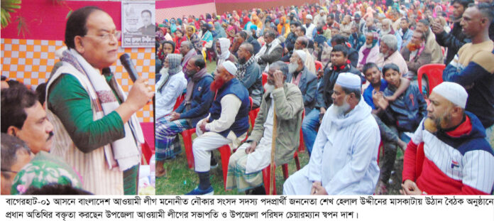 মেহেদী হাসান বাগেরহাট : বাগেরহাট-০১ আসনে বাংলাদেশ আওয়ামী লীগ মনোনীত নৌকার সংসদ সদস্য পদপ্রার্থী জননেতা শেখ হেলাল উদ্দীনের নৌকার উঠান বৈঠক অনুষ্ঠান রবিবার (২৪ ডিসেম্বর) বিকেল সাড়ে ৫টায় ফকিরহাটের বেতাগা ইউনিয়নের মাসকাটা গ্রামের কুতুব আলী শেখ এর বাড়ির উঠানে অনুষ্ঠিত হয়েছে। নির্বাচন পরিচালনা ও কেন্দ্র কমিটির আহবায়ক মোঃ ইউনুস আলী শেখ এর সভাপতিত্বে সভায় প্রধান অতিথি ছিলেন উপজেলা আওয়ামী লীগের সভাপতি ও উপজেলা পরিষদ চেয়ারম্যান স্বপন দাশ। বিশেষ অতিথি ছিলেন উপজেলা আ’লীগের সাধারন সম্পাদক মল্লিক আবুল কালাম আজাদ ও সংগঠনিক সম্পাদক শেখ আসলাম আলী। কেন্দ্র সচিব মোঃ নাজমুল হুদার সঞ্চালনায় এতে আরো বক্তৃতা করেন, ইউনিয়ন আ’লীগের সাধারন সম্পাদক আনন্দ কুমার দাশ, কৃষকলীগ নেতা মোঃ জামাল উদ্দিন ফকির, শ্রমিকলীগ নেতা শেখ মাহাবুর রহমান, ইউপি সদস্য ইনছান উদ্দিন, আ’লীগ নেতা আসাদুজ্জামান, নিজাম উদ্দিন ফকির ও মহিলা নেত্রী রাফেজা বেগম। এর আগে লখপুর ইউনিয়নের রাধা-বল্লভপুর দূর্গামন্দির চত্তর, কাহারডাঙ্গা সরকারী প্রাথমিক বিদ্যালয়ের সামনে ও শুভদিয়া ইউনিয়নের তেকাটিয়া এলাকায় অনুরুপ উঠান বৈঠক অনুষ্ঠিত হয়েছে। এতে প্রধান অতিথি হিসাবে উপজেলা আওয়ামী লীগের সভাপতি স্বপন দাশ উপস্থিত থেকে বক্তৃতা করেন। উঠান বৈঠক অনুষ্ঠানে বিপুল সংখ্যাক নেতাকর্মি ও ভোটাররা উপস্তিত ছিলেন।