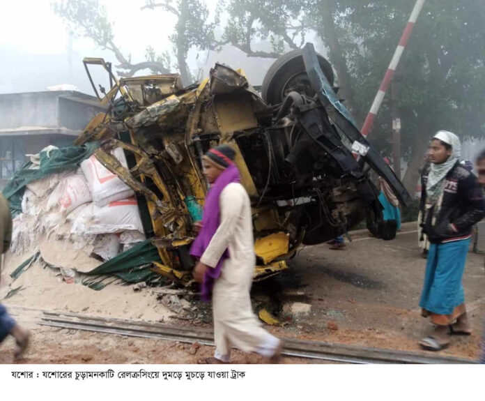 স্টাফ রিপোর্টার : যশোর-চৌগাছা সড়কের চুড়ামনকাটি রেল ক্রসিংয়ে ট্রেনের ধাক্কায় ট্রাক চূর্ণবিচূর্ণ হয়ে চালক ও হেলপার নিহত হয়েছেন। রোববার ভোর সাড়ে পাঁচটার দিকে এ দুর্ঘটনা ঘটে। নিহতরা হলেন, ঝিনাইদহের কোটচাঁদপুর উপজেলার কাগমারী গ্রামের বাহাদুর মিয়ার ছেলে ট্রাক চালক পারভেজ হোসেন (৫০) ও মহেশপুর উপজেলার আজমপুর গ্রামের মৃত শহিদুল ইসলাম ওরফে শহিদের ছেলে হেলপার নাজমুল ইসলাম (৪০)। স্থানীয়দের ভাষ্য, দুর্ঘটনার সময় প্রচন্ড কুয়াশাচ্ছন্ন ছিলো। ওই সময় গেটম্যান ঘুমিয়ে ছিলেন। গেটম্যানের দায়িত্ব অবহেলার কারণে এই দুর্ঘটনাটি ঘটেছে। রেলক্রসিংয়ে এ দুর্ঘটনা ঘটার পর থেকে ওই রেলক্রসিংয়ের গেটম্যান পলাতক রয়েছেন। পুলিশ ও স্থানীয়দের সঙ্গে কথা বলে এসব তথ্য জানা গেছে। পুলিশ ও স্থানীয় সূত্র জানায়, ভোর সাড়ে ৫টার দিকে চিলাহাটি থেকে ছেড়ে আসা রকেট মেইল ট্রেনটি খুলনার উদ্দেশ্য যাচ্ছিলো। ট্রেনটি যখন যশোর সদর উপজেলার চূড়ামনকাটি রেল ক্রসিং পার হচ্ছিলো; এসময় চৌগাছাগামী ভূষিবাহী (ঝিনাইদহ ট- ১১-১৬৬৭) একটি ট্রাক ক্রসিংয়ে উঠে পড়ে। রেল ক্রসিংয়ের ব্যরিয়ার (প্রতিরোধক বার) খোলা থাকাতে ট্রাকটি ক্রসিংয়ে ঢুকে পড়ে। এমন সময় এই দুর্ঘটনাটি ঘটে। এতে ট্রাকের হেলপার ও ড্রাইভার ঘটনাস্থলেই মারা যান। দুর্ঘটনার পরপরই ফায়ার সার্ভিস, রেলওয়ে পুলিশ, সদর পুলিশসহ প্রশাসন উদ্ধার তৎপরতা শুরু করে। স্থানীয় বাসিন্দা চুড়ামনকাটি গ্রামের আনিসুর রহমান বলেন, ‘আজ ভোর থেকেই এলাকা ঘন কুয়াশায় আচ্ছাদিত ছিলো। বাড়ির মধ্যে থেকে বিকট শব্দ শুনে রাস্তায় বের হয়ে দেখি রেল লাইনের পাশে উল্টে আছে বড় ট্রাক। ট্রাকটি দেখেই বুঝলাম ট্রেনের ধাক্কা খেয়েছে। কাছে যেয়ে দেখি ট্রাকের ভিতরে দুটি মানুষ। তারা দুজনেই রক্তাক্ত অবস্থায় পড়ে রয়েছে। এরপর পুলিশ আর ফায়ার সার্ভিস এসে ট্রাকে থাকা ভুষি সরিয়ে ট্রেন লাইন পরিস্কার করে। আর নিহত দু’জনের মরদেহ উদ্ধার করে যশোর জেনারেল হাসপাতালের মর্গে পাঠায়। তিনি জানান, এই রেলক্রসিংয়ে দায়িত্বে ছিলেন চুড়ামনকাটি দাসপাড়া এলাকার সজল কুমার। তিনি গেট লাগানোর দায়িত্ব পালন না করে ঘুমিয়ে থাকায় বড় ধরণের দুর্ঘটনাটি ঘটেছে। এদিকে দুর্ঘটনার খবর পেয়ে যশোর সেনানিবাস ফায়ার স্টেশনের কর্মীরা ঘটনাস্থলে পৌঁছায়। সিনিয়র স্টেশন কর্মকর্তা নাহিদ মামুন বলেন, ‘সকাল ৫টা ৪৫ মিনিটে আমরা দুর্ঘটনার খবর পেয়ে দ্রুত ঘটনাস্থলে যাই। ভুষিবোঝাই ট্রাকটি উল্টে গেছিল। তার সামনের অংশ দুমড়ে-মুচড়ে যায়। আমরা স্পট ডেড হিসেবে ট্রাকের চালক ও হেলপারকে উদ্ধার করি। তিনি আরও বলেন, আমরা রেল লাইনের উপরে পড়া থাকা ভুষি পরিষ্কার করি। পরে পুলিশ এসে ট্রেকার দিয়ে ট্রাকটি সরিয়