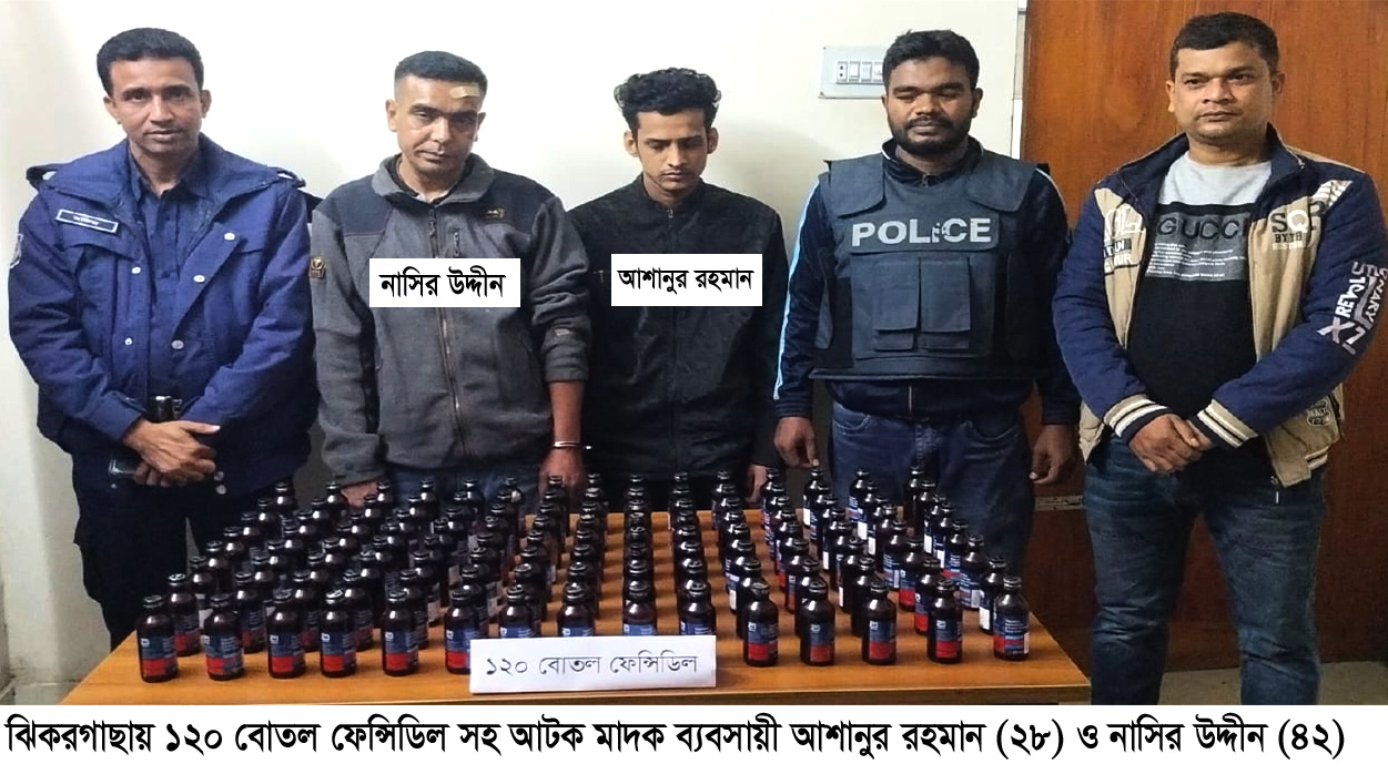 ঝিকরগাছায় ১২০ বোতল ফেন্সিডিল সহ দুই মাদক ব্যবসায়ী আটক