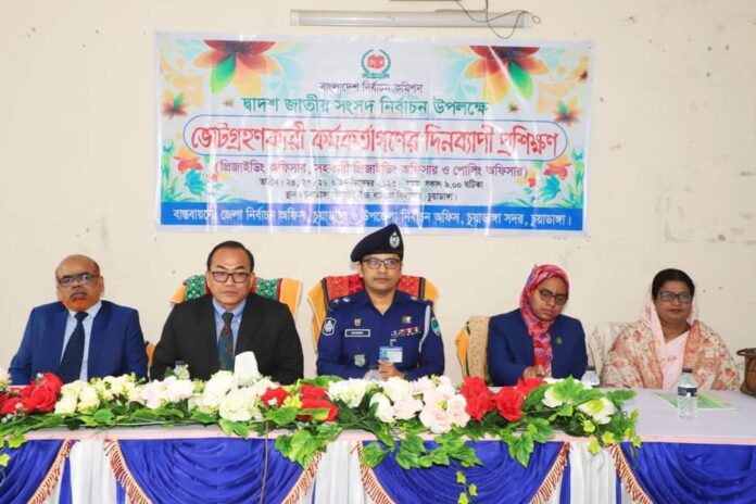 মাহমুদ হাসান রনি,দামুড়হুদা(চুয়াডাঙ্গা) প্রতিনিধিঃ চুয়াডাঙ্গায় দ্বাদশ জাতীয় সংসদ নির্বাচন উপলক্ষে ভোট গ্রহণকারী কর্মকর্তাগণের নিয়ে দিনব্যাপী প্রশিক্ষণ কর্মসূচী অনুষ্ঠিত হয়েছে।