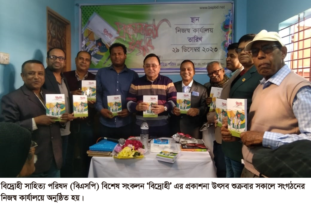 স্টাফ রিপোর্টার : মহান বিজয় দিবস ২০২৩ উপলক্ষে বিদ্রোহী সাহিত্য পরিষদ (বিএসপি) বিশেষ সংকলন ‘বিদ্রোহী’এর প্রকাশনা উৎসব শুক্রবার (২৯ ডিসেম্বর) সকাল ১১টায় শহরের পোস্ট অফিস পাড়ার সংগঠনের নিজস্ব কার্যালয়ে অনুষ্ঠিত হয়েছে।