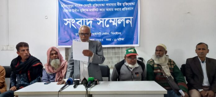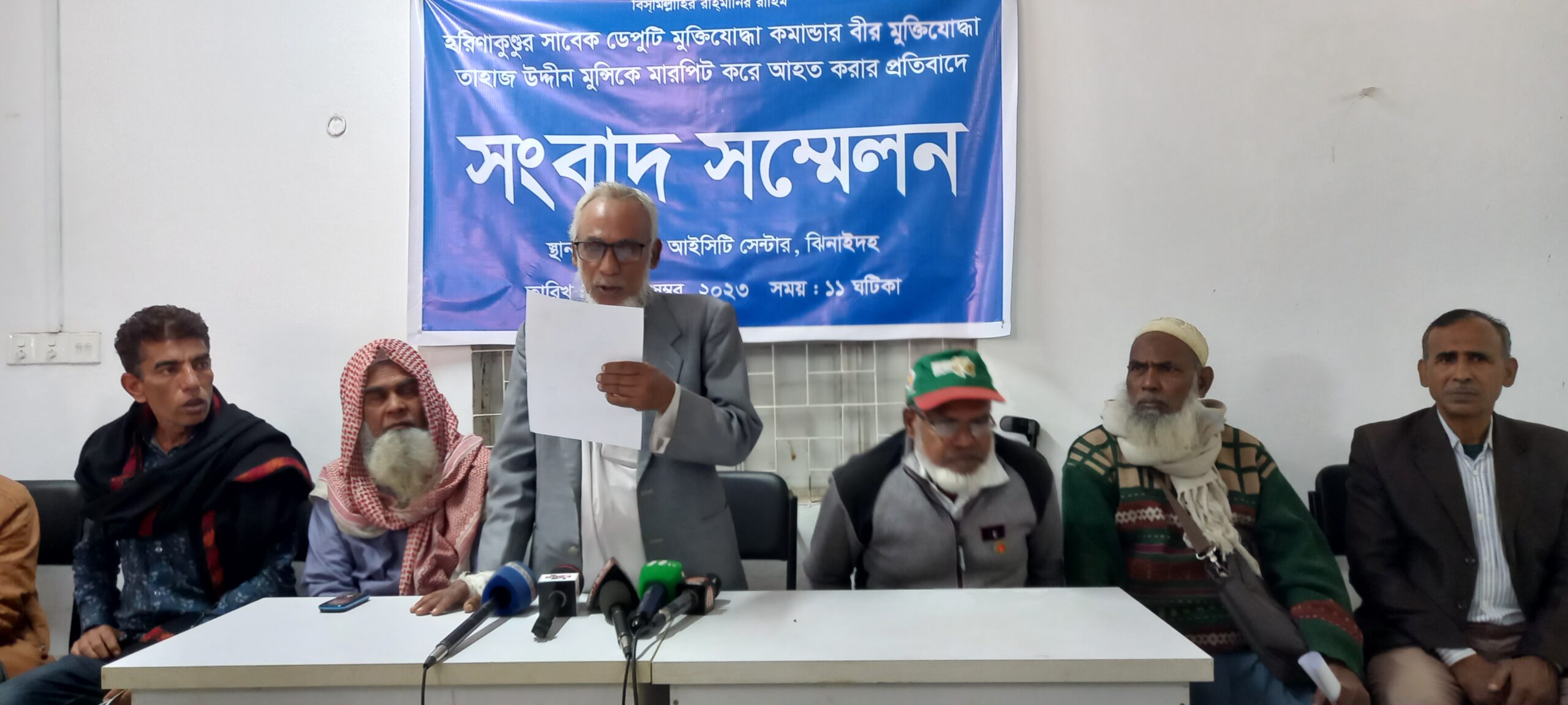 সংবাদ সম্মেলনে মুক্তিযোদ্ধা ইউসুফ আলী, জানে আলম, আব্দুল ওহাব প্রমুখ উপস্থিত ছিলেন। বীর মুক্তিযোদ্ধা তাহাজ উদ্দীন মুন্সি লিখিত বক্তব্যে জানান, ‘শুক্রবার (২৯ ডিসেম্বর) দুপুর ১২টার দিকে জিন্দারের মোড় বাজারে চুল কাটানোর উদ্দেশ্যে যায়। এসময় নৌকা প্রতীকের সমর্থক ও চাঁদপুর ইউনিয়ন আওয়ামী লীগের সাধারন সম্পাদক রাশিদুল্লাহ রাশিদ দৌড়ে এসে আমাকে অকথ্য ভাষায় গালিগালাজ করে। গালিগালাজের কারন জিজ্ঞাসা করিলে সে উত্তেজিত হয়ে বলে তুই নৌকা প্রতীকের বিপক্ষে কাজ করতেছিস। সে আমার কথা না বিশ্বাস না করে আমাকে এলোপাতাড়ি ভাবে মারপিট করতে থাকে। মারপিটের ফলে আমি রাস্তার উপর পড়ে যায়। এতে আমার ডান হাতে তালুতে আঘাত লাগে। এসময় আমার চিৎকার শুনে পাশের লোকজন এসে উদ্ধার করে।’ তিনি আরো বলেন ‘রাশিদুল্লাহ আমাকে খুন জখমের হুমকি প্রদান করে চলে যায়। এতে আমার প্রান নিয়ে আমি শংকিত। এঘটনায় হরিণাকুন্ডু থানায় একটি সাধারন ডায়েরী করেছি। সংবাদ সম্মেলনের মাধ্যমে প্রধানমন্ত্রীর হস্তক্ষেপ কামনা করেন। সেই সাথে প্রশাসনের আইনগত ব্যবস্থা গ্রহনের দাবি জানান।’