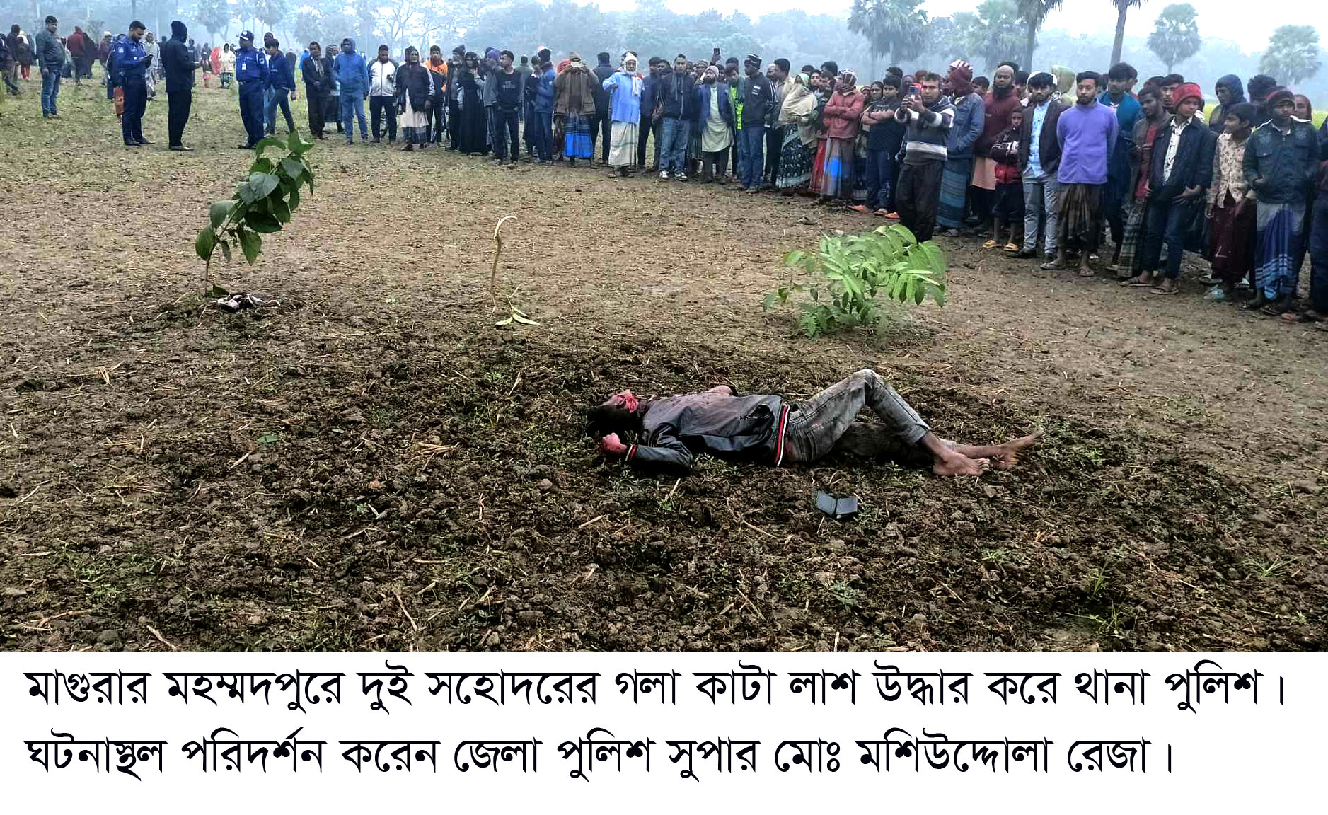 নিহতের পরিবার সুত্রে জানা যায়, শনিবার রাত সাড়ে ৮ টার দিকে ফারুক শিকদারের ছেলে আশিক, বিপ্লব ও হাসিব শিকদার দুই ভাইকে খুজতে বাড়ির উপর আসে। রাতের মধ্যে তারা বী আসেনি। পরের দিন সকালে মাঠের মধ্যে দুই ভাইয়ের গলাকাটা লাশ পাওয়া গেছে বলে আমরা জানতে পারি। এটি একটি পরিকল্পিত হত্যাকান্ড। ঘটনার সুষ্ঠু তদন্ত করে হত্যার সাথে জড়িতদের আইনের আওতায় এনে ন্যায় বিচারের দাবি জানান প্রশাসনের নিকট।মহম্মদপুর থানার অফিসার ইনচার্জ মোঃ বোরহান উল ইসলাম বলেন, লাশ উদ্ধার করে ময়নাতদন্তের জন্য মাগুরা সদর হাসপাতালের মর্গে প্রেরণ করা হয়েছে এবং স্থানীয় দুজনকে জিজ্ঞাসাবাদের জন্য আটক করা হয়েছে। বাকীদেরকে আটকের চেষ্টা চলছে। প্রতিবেশিদের সাথে জমিজমা বিরোধের জেরে এই ঘটনা ঘটতে পারে বলে ধারনা করা হচ্ছে।