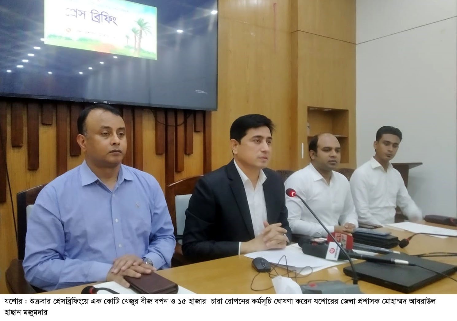 শুক্রবার বিকেলে (৫ জুলাই) প্রেসব্রিফিংয়ে এই খেজুর বীজ বপন ও চারা রোপনের কর্মসূচি ঘোষণা করেন যশোরের জেলা প্রশাসক মোহাম্মদ আবরাউল হাছান মজুমদার। যশোর কালেক্টরেট সনেট সভাকক্ষে অনুষ্ঠিত প্রেসব্রিফিংয়ে উপস্থিত ছিলেন, অতিরিক্ত জেলা প্রশাসক (সার্বিক) এসএম শাহীন, অভয়নগরের উপজেলা নির্বাহী কর্মকর্তা কেএম আবু নওশাদ, ঝিকরগাছার উপজেলা নির্বাহী কর্মকর্তা নারায়ন চন্দ্র পাল, শার্শা উপজেলা নির্বাহী কর্মকর্তা নয়ন কুমার রাজবংশী প্রমুখ। প্রেসব্রিফিংয়ে যশোরের জেলা প্রশাসক মোহাম্মদ আবরাউল হাছান জানান, নির্বিচারে বৃনিধন এবং রস সংগ্রহ ও গুড় শিল্পে গাছিদের আগ্রহ কমে যাওয়ায় একসময় যশোরের সুপ্রাচীন ঐতিহ্য খেজুর গুড়ের শিল্প হুমকির মুখে পড়ে। কিন্তু যশোরের জেলা প্রশাসনের নানামুখী উদ্যোগে এরই মধ্যে শিল্পটির সুদিন ফিরতে শুরু করেছে। সম্প্রতি যশোরের খেজুরগুড়ের জিআই সনদ লাভের প্রেেিত খেজুর গুড়ের যথার্থ গুণগত মান নিশ্চিতকরণ এবং খেজুর গাছের চারা আরো সহজলভ্য করার ল্েয দায়বদ্ধতা আরও বৃদ্ধি পেয়েছে বলে জেলা প্রশাসন মনে করে।