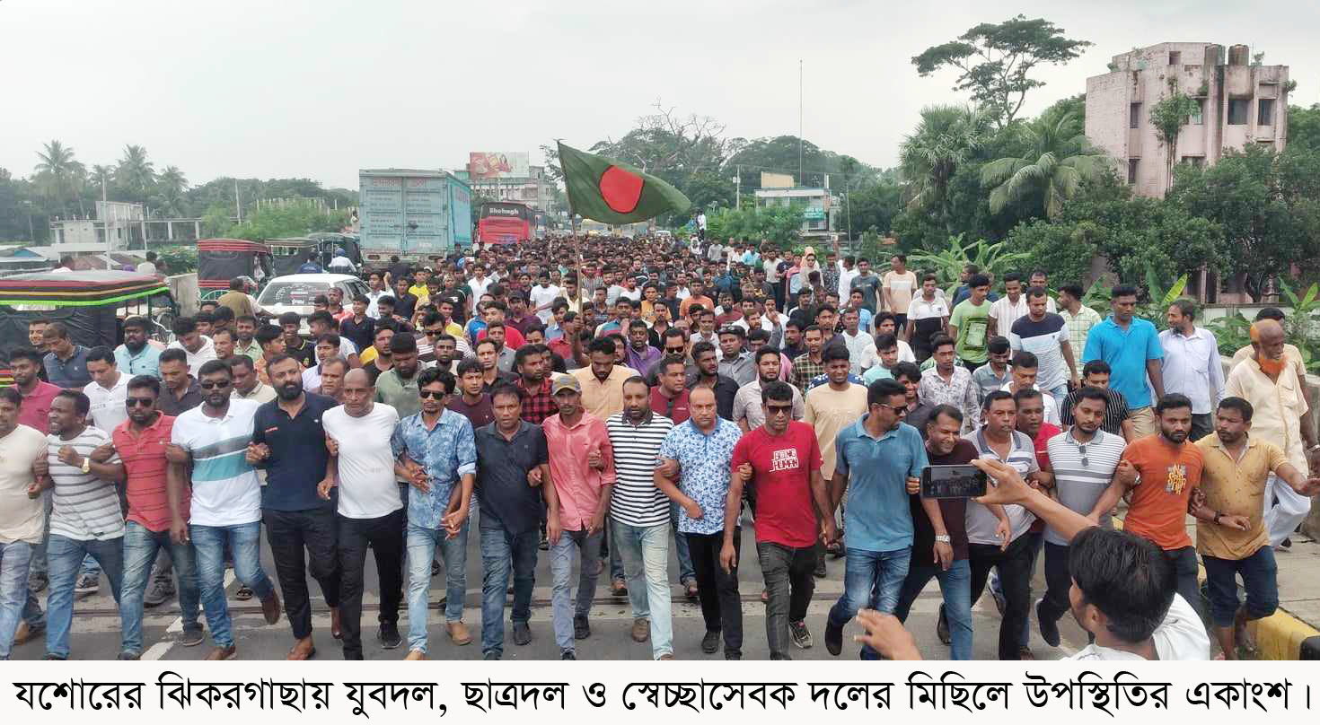 যশোরের ঝিকরগাছায় যুবদল, ছাত্রদল ও স্বেচ্ছাসেবক দলের উদ্যোগে বিক্ষোভ মিছিল