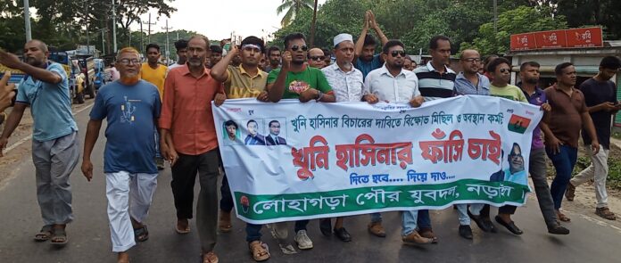 শেখ হাসিনার ফাঁসির দাবিতে লোহাগড়ায় পৌর যুবদলের বিক্ষোভ মিছিল,সমাবেশ