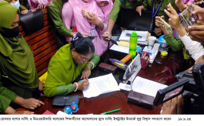 স্টাফ রিপোর্টার : যশোর নার্সিং ও মিডওয়াইফারি কলেজের নার্সিং ইন্সট্রাক্টর ইনচার্জ খুকু বিশ্বাস পদত্যাগ করেছেন। প্রতিষ্ঠানের শিক্ষার্থীরা অনিয়মের অভিযোগ তুলে আন্দোলন করলে রোববার (১৮ আগস্ট) দুপুরে তিনি নার্সিং ও মিডওয়াইফারি অধিদপ্তরের মহাপরিচালক বরাবর লেখা পদত্যাগপত্রে স্বার করেন। এসময় যশোরের সিভিল সার্জন ও ২৫০ শয্যা হাসপাতালের তত্ত্বাবধায়ক উপস্থিত ছিলেন। সরেজমিনে দেখা যায়, রোববার (১৮ আগস্ট) সকাল ৯টার দিকে যশোর নার্সিং ও মিডওয়াইফারি কলেজের মূল ফটকের সামনে অবস্থান নেয় আন্দোলকারী সাড়ে তিনশতাধিক শিার্থীরা। এক পর্যায়ে নার্সিং ইনস্ট্রাক্টর ইনচার্জের কে প্রবেশ করে ইনচার্জকে ঘেরাও করে বিভিন্ন স্লোগান দিতে থাকেন তারা। টানা পাঁচ ঘণ্টা আন্দোলনের পর দুপুর ২টার দিকে পদত্যাগপত্রে স্বার করেন ইন্সট্রাক্টর ইনচার্জ খুকু বিশ্বাস। পদত্যাগের পর ভারপ্রাপ্ত দায়িত্ব গ্রহণ করেন নার্সিং ইন্সট্রাক্টর আরজিনা খাতুন। ইনচার্জের পদত্যাগে সন্তোষ প্রকাশ করে উল্লাস করেন যশোর নার্সিং ও মিডওয়াইফারি কলেজের শিার্থীরা।