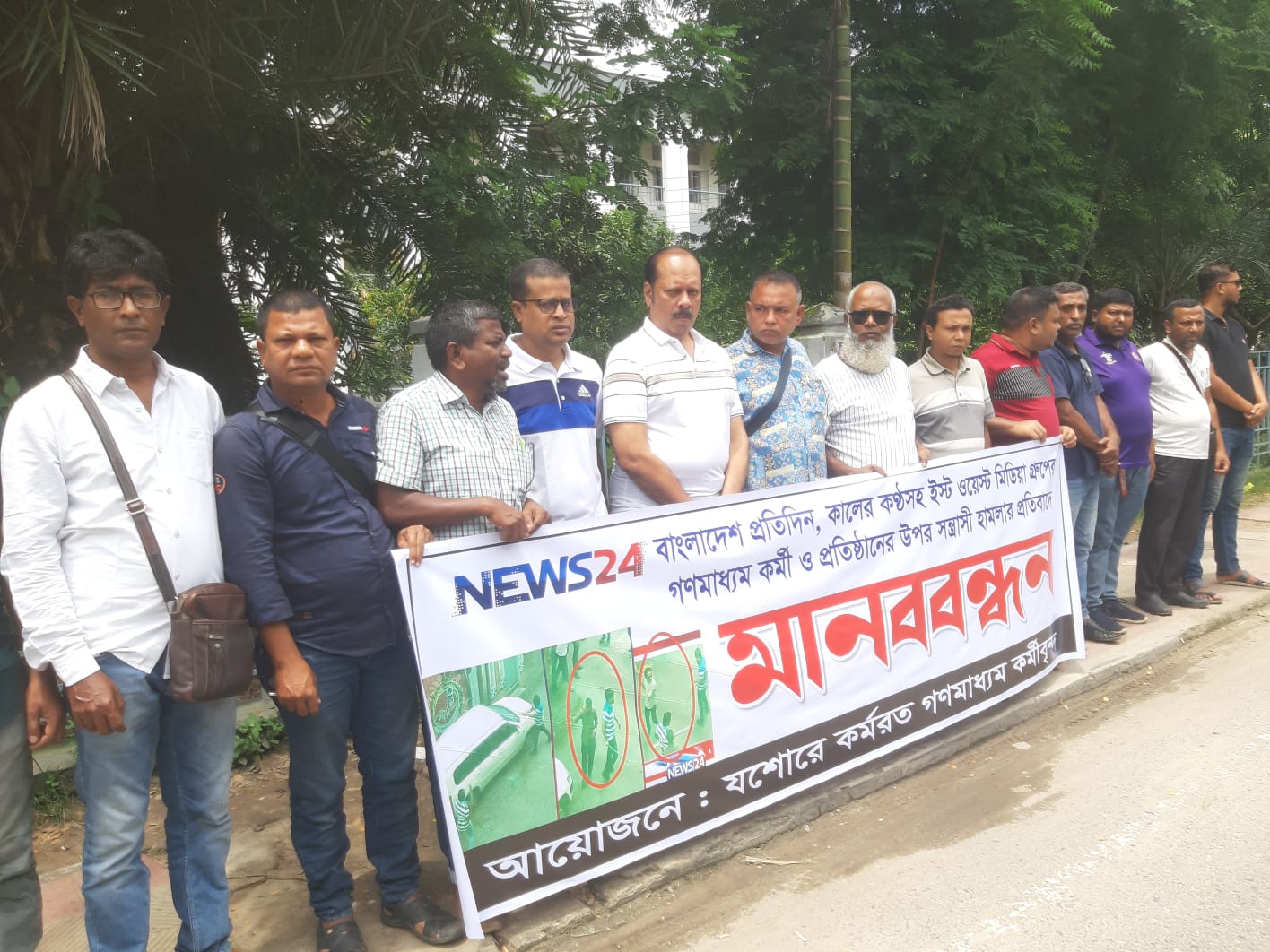 যশোর অফিস : নিউজ টোয়েন্টিফোর, বাংলাদেশ প্রতিদিন, কালের কণ্ঠসহ ইস্ট ওয়েস্ট মিডিয়া গ্রুপের গণমাধ্যম কর্মী ও প্রতিষ্ঠানের ওপর সন্ত্রাসী হামলার প্রতিবাদে মানববন্ধন কর্মসূচি করেছে যশোরে কর্মরত গণমাধ্যমকর্মীরা।মঙ্গলবার (২০ আগস্ট) দুপুরে প্রেসক্লাব যশোরের সামনে এই প্রতিবাদী কর্মসূচি পালন করেন বিভিন্ন ইলেকট্রনিক ও প্রিন্ট মিডিয়ার সাংবাদিকেরা।প্রেসক্লাব যশোরের সভাপতি জাহিদ হাসান টুকুনের সভাপতিত্বে মানববন্ধনে বক্তব্য রাখেন প্রেসক্লাব যশোরের সাধারণ সম্পাদক চ্যানেল টোয়েন্টিফোরের সিনিয়র স্টাফ রিপোর্টার এসএম তৌহিদুর রহমান, সাংবাদিক ইউনিয়ন যশোরের সভাপতি চ্যানেল আই এর যশোর প্রতিনিধি আকরামুজ্জামান, যশোর সাংবাদিক ইউনিয়নের সভাপতি মনতোষ বসু, মানবজমিনের নিজস্ব প্রতিবেদক নূর ইসলাম, দৈনিক সমাজের কথার ভারপ্রাপ্ত সম্পাদক আমিনুর রহমান প্রমুখ। মানবন্ধনে বক্তারা বলেন, বিগত দিনগুলোতে বিভিন্ন সময়ে গণমাধ্যমকর্মীদের ওপর হামলা এবং নির্যাতনের ঘটনা ঘটেছে। সংবাদ প্রকাশের জেরে সাংবাদিকদের নামে হয়রানিমূলক মামলা এবং সন্ত্রাসী হামলা করে হত্যাকান্ড চালানো হয়েছে। এসব ঘটনার পরেও সাবেক পদত্যাগ করা আওয়ামী লীগ সরকার সাংবাদিকদের ওপর নির্যাতনের ঘটনায় নিরব ভূমিকা পালন করেছে।সাংবাদিকরা আরও বলেন, বর্তমান সময়ে সাধারণ শিক্ষার্থীদের সৈরাচার সরকার পতনের আন্দোলন এবং গণঅভ্যুত্থানের মধ্যে দিয়ে সৈরাচার সরকারের পতন হয়েছে। বর্তমান অর্ন্তবর্তীকালীন সরকারে প্রশ্নবিদ্ধ করতে এক শ্রেনীর কুচক্রী, দুষ্কৃতকারীরা পরিকল্পিতভাবে এ সকল হামলার ঘটনা  ঘটাচ্ছে। আমরা চাই গণমাধ্যমে মত প্রকাশের পূর্ণ স্বাধীনতা দেওয়া হোক এবং একইসাথে এসকল নাশকতার সাথে জড়িতদের দ্রুত চিহ্নিত করে আইনের আওতায় এনে দৃষ্টান্তমূলক শাস্তির ব্যবস্থা করা হোক এবং মফস্বলসহ সকল পর্যায়ের সাংবাদিকদের পেশাগত দায়িত্ব পালনে নিরাপত্তা নিশ্চিত করা হোক।মানববন্ধনে এ সময় আরও উপস্থিত ছিলেন, নিউজ টোয়েন্টিফোরের জেলা প্রতিনিধি বুলবুল শহীদ খান হিমেল, যায়যায়দিন এর নিজস্ব প্রতিবেদক হাবিবুর রহমান মিলন, দৈনিক যুগান্তরের যশোর ব্যুরো প্রধান ইন্দ্রজিৎ রায়, দৈনিক রানার পত্রিকার প্রকাশক উত্তম কুমার ঘোষ, সময় টেলিভিশনের নিজস্ব প্রতিবেদক জুয়েল মৃধা, ফটো জার্নালিস্ট এ্যাসোসিয়েশন যশোরের সভাপতি গোপিনাথ দাস, ঢাকা পোস্টের জেলা প্রতিনিধি এ্যান্টনি দাস অপুসহ বিভিন্ন ইলেক্ট্রনিক ও প্রিন্ট মিডিয়ার প্রতিবেদক ও ফটো সাংবাদিকবৃন্দরা।