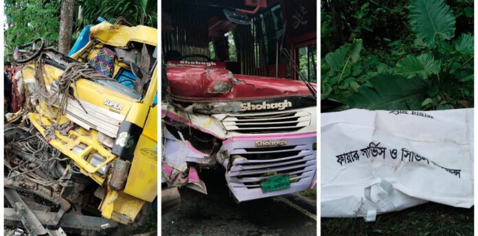 যশোর অফিস : যশোরে সোহাগ পরিবহনের সাথে ট্রাক ও ইজিবাইকের ত্রিমুখি সংঘর্ষে ঘটনাস্থলে ট্রাক ড্রাইভার হারুন হোসেন (২৫) নিহত হয়েছেন। এ ঘটনায় আহত হয়েছেন পরিবহন ও ট্রাকের হেল্পারসহ আরও ১৩জন। এদের মধ্যে ৮জনকে যশোর ২৫০শয্যা জেনারেল হাসপাতাল থেকে চিকিৎসা নিয়েছেন। বাকিরা স্থানীয় বিভিন্ন সেবা কেন্দ্র থেকে চিকিৎসা নিয়েছেন। রোববার দুপুর দুইটার দিকে যশোর-নড়াইল সড়কের ফতেপুর বাজার সংলগ্ন এলাকায় এই দুর্ঘটনাটা ঘটে।নিহত ট্রাকচালক হারুন সদর উপজেলার ঝুমঝুমপুর চান্দের মোড় এলাকার চান মিয়ার ছেলে।এ ঘটনায় আহতরা হলেন,আহতরা যশোর সদর উপজেলার হামিদপুর মাঠপাড়া এলাকার ইউনুস মোল্লার ছেলে ইজিবাইক চালক রফিকুল ইসলাম(৩০), সোহাগ পরিবহনের যাত্রী নড়াইল সদর উপজেলার হোগলা গ্রামের সালাউদ্দিন হোসেনের ছেলে তামিম (২০) এবং যশোর শহরতলীর শেখহাটি বাবলাতলা এলাকার শফিকুর রহমানের মেয়ে সানজিনা (২২)। এছাড়া হাসপাতাল থেকে প্রাথমিক চিকিৎসা নিয়েছেন ট্রাকের হেলপার ফয়েজ উদ্দিন (৩২), সোহাগ পরিবহনের হেলপার রফিক(২৮), ইজি বাইকের যাত্রী শাওন (২২), রোকসানা বেগম (২০),আলতাব হোসেন (৩৫)।বাকিরা বিভিন্ন সেবা প্রতিষ্ঠান থেকে চিকিৎসা নিয়েছেন। আহত সানজিদা ও তামিম জানান,রোববার দুপুরে মনিহারে সামনের থেকে সোহাগ পরিবহন করে ঢাকার উদ্দেশ্যে রওনা দেন। পথিমধ্যে ফতেপুর বাজারের কাছে পৌঁছালে সোহাগ পরিবহনের(যার নাম্বার ঢাকা মেট্রো ব-১৪-৬৫৫২) সাথে যশোরগামী ট্রাক (ঢাকা মেট্রো -ড ১১-৭৫৩৭) এবং একটি ইজিবাইকের সাথে ত্রিমুখী সংঘর্ষ হয়। এতে ঘটনাস্থলে ট্রাকচালক নিহত হন ও ১৩জন গুরুতর আহত হন। এত মধ্যে আটজনকে যশোর ২৫০শয্যা জেনারেল হাসপাতালে নেওয়া হলে। চিকিৎসক ৩জনকে ভতি করেন।বাকি ৫জন হাসপাতাল থেকে প্রাথমিক চিকিৎসা নিয়েছেন। যশোর জেনারেল হাসপাতালের জরুরী বিভাগের কর্তব্যরত চিকিৎসক বিচিত্র মল্লিক জানান, আহত অবস্থায় ৮জনক হাসপাতালে আনা হয়। এদের মধ্যে তিনজনকে ভর্তি করা হয়েছে। বাকিদের প্রাথমিক চিকিৎসা শেষে বাড়িতে পাঠিয়ে দেওয়া হয়েছে। লাশ ময়না তদন্তের জন্য হাসপাতালের মর্গে প্রেরণ করা হয়েছে।