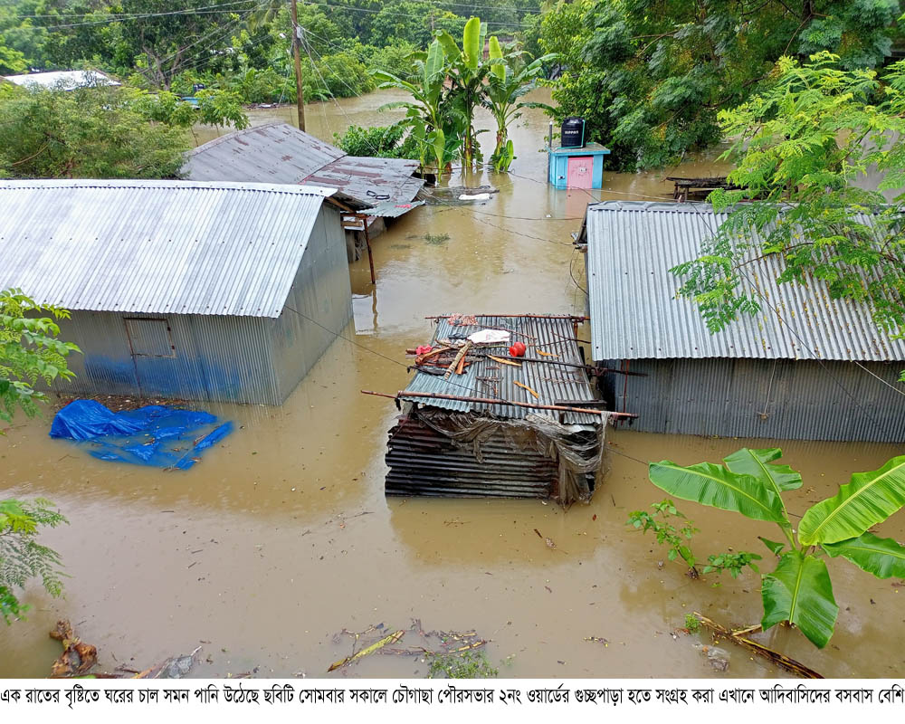 সোমবার সকালে ২নং ওয়ার্ডের গুচ্ছপাড়ায় যেয়ে দেখা যায় ঘরের চাল ছুইছুই পানি। মহল্লায় অধিকাংশ আদিবাসিদের বসবাস। তারা বৃষ্টির মধ্যে ঘরের মালামাল নিয়ে বিভিন্ন স্থানে চলে যান। এসময় কথা হয় দুষ্টু সরদার, চন্দন সরদার, রুপা রানি সরদার, বাসন্তি সরদারের সাথে। তারা বলেন, অল্প বৃষ্টিতেই মহল্লায় পানি জমে আর একটু বেশি হলে তো ঘরে পানি উঠে যায়। পানি বের হওয়ার কোন পথ না থাকায় প্রতি বছর বর্ষা মৌসুমে আমরা সন্তানাদি নিয়ে নিদারুন কষ্টে দিন পার করি। বর্তমানে ঘরবাড়ি ছেড়ে বিভিন্ন জায়গায় অবস্থান নেয়া হয়েছে।