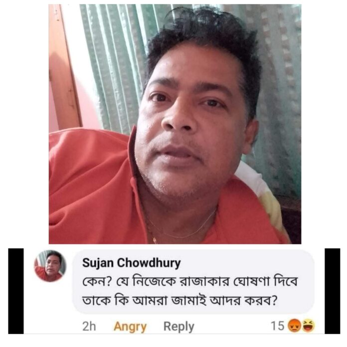 গত ১৬ই জুলাই সাবেক প্রধানমন্ত্রী শেখ হাসিনা সাধারণ শিার্থীদের রাজাকার সন্মোধন করা বক্তব্যের পে যুক্তি দিয়ে সামাজিক যোগাযোগ মাধ্যম ফেসবুকে বিতর্কিত মন্তব্য করেন সুজন চৌধুরী। তিনি লিখেন, “কেন? যে নিজেকে রাজাকার ঘোষনা করবে তাকে কি আমরা জামাই আদর করবো?”