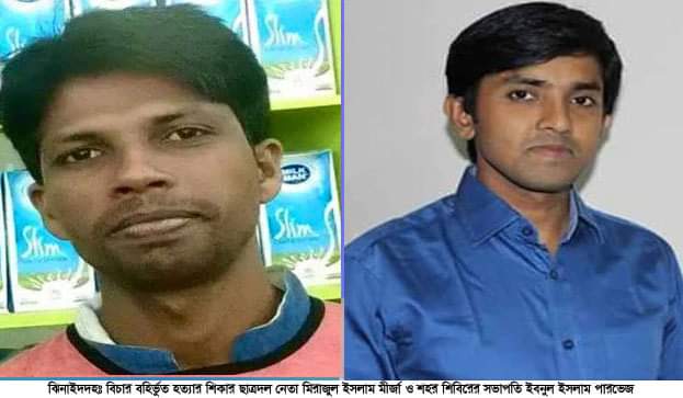 কামরুজ্জামান লিটন ঝিনাইদহ : বিচার বহির্ভুত হত্যাকান্ডের শিকার ঝিনাইদহের ছাত্রদল নেতা মিরাজুল ইসলাম মীর্জা ও শিবির সভাপতি ইবনুল ইসলাম পারভেজ হত্যার ঘটনায় পৃথক দুইটি মামলা হয়েছে। বৃহস্পতিবার ঝিনাইদহের একটি আদালতে সাবেক এক পুলিশ সুপারসহ ১১ পুলিশ কর্মকর্তার বিরুদ্ধে পৃথক দুইটি মামলা দায়ের করেন নিহত’র স্বজনরা। মামলায় ঝিনাইদহের সাবেক পুলিশ সুপার আলতাফ হোসেন (চাকরীচ্যু), সাবেক অতিরিক্ত পুলিশ সুপার আজবাহার আলী শেখ, সহকারী পুলিশ সুপার গোপিনাথ কানজিলাল, সদর থানার সাবেক ওসি হাসান হাফিজুর রহমান, ডিবির ওসি কামরুল ইসলাম, এসআই আমিনুর রহমান, এসআই বোরহানুল ইসলাম, এসআই শাহরিয়ার হাসান, এসআই আমিনুল ইসলাম, এসআই উজ্জল মৈত্র ও ডিবির ওয়াচার মুরাদকে আসামী করা হয়েছে। এছাড়া ঝিনাইদহ জেলা আওয়ামী লীগের সাধারন সম্পাদক সাইদুল করিম মিন্টুসহ দলের ১৭ শীর্ষ নেতাকে পারভেজ হত্যা মামলায় আসামী করেছে। ঝিনাইদহ সিনিয়র জুডিশিয়াল ম্যাজিষ্ট্রেট আদালতের বিচারক মামলা দুইটি এজাহার হিসেবে গ্রহন করতে ঝিনাইদহ সদর থানাকে নির্দেশ দিয়েছেন। বিচার বহির্ভুত হত্যাকান্ডের শিকার যুবদল নেতা মিরাজুল ইসলাম মীর্জাকে ২০১৫ সালের ১৮ মার্চ ঝিনাইদহ শহরের একটি ছাত্রাবাস থেকে পুলিশ পরিচয়ে তুলে নিয়ে যাওয়া হয়। ওই মাসের ২৫ তারিখে মীর্জার গুলিবিদ্ধ লাশ পাওয়া যায় চুয়াডাঙ্গা সদর উপজেলার খাড়াগোদা এলাকার পন্নাতলা মাঠে। হত্যার ৯ বছর পর তার বৃদ্ধা মা বুলবুলি খাতুন সে সময়কার সাবেক পুলিশ সুপার আলতাফ হোসেন, এসআই শাহরিয়ার হাসান ও এসআই আমিনুল ইসলামকে আসামী করেন। অন্যদিকে আরেক বিচার বহির্ভুত হত্যাকান্ডের শিকার ঝিনাইদহ শহর শিবিরের সভাপতি ইবনুল ইসলাম পারভেজ হত্যা মামলাটি করেছেন তার পিতা জাহাঙ্গীর হোসেন। তিনি আদালতে দায়েরকৃত অভিযোগ উল্লেখ করেন, ঝিনাইদহের পুলিশ সুপার আলতাফ হোসেন ও আ’লীগের সন্ত্রাসীরা মিলিত ভাবে শিবিরকে নিশ্চিহ্ন করার অংশ হিসেবে ইবনুল ইসলাম পারভেজকে ২০১৬ সালের ১৬ জুন ঢাকা থেকে আটক করে নিয়ে আসে। তাকে চোখ মুখ বেধে অকথ্য নির্যাতন করে আসামীরা। এরপর অপহরণের ১৭ দিন পর ২০১৬ সালের ২ জুলাই ঝিনাইদহ সদর উপজেলার আড়য়াকান্দি এলাকায় ইবনুল ইসলাম পারভেজের গুলিবিদ্ধ লাশ পাওয়া যায়। তাকে বিচার বহির্ভুত হত্যাকান্ডের শিকার হতে হয়।