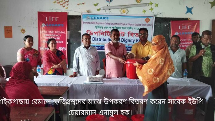 পাইকগাছা প্রতিনিধি। পাইকগাছার ঘুর্নিঝড় রেমালে ক্ষতিগ্রাস্থ সোলাদানা ইউনিয়নের হাজার পরিবারে ডিকনিটি( মর্যাদা উপকরণ) কীট বিতরণ করা হয়েছে। ২৮ আগস্ট বুধবার সকাল ১০ টায় বেসরকারী উন্নয়ন সংস্থা লিডার্সের উদ্যোগে এসব উপকরণ বিতরণ করা হয়। বাস্তবায়ন দাতা সংস্থা ফ্রান্সের LiFE- ONG এর সহযোগিতায় “Emergency WASH Response to Cyclone Remal Affected People in Paikgacha Upazilla of Khulna District” প্রকল্পের আওতায় সোলাদানা মাধ্যমিক বিদ্যালয়ে ১ হাজার কিশোরী, যুব নারী ও দরিদ্র পরিবারের মাঝে ডিগনিটি কীট (মর্যাদা উপকরন) বিতরণ করা হয়েছে। বিদ্যালয় প্রধান শিক্ষক আমিনুর রহমানের সভাপতিত্বে অনুষ্ঠেয় এ অনুষ্ঠানে প্রধান অতিথি ছিলেন সোলাদানা সাবেক ইউপি চেয়ারম্যান এস.এম এনামূল হক। স্বাগত বক্তব্য দেন লিডার্সের প্রকল্প সমন্বয়কারী দেবব্রত কুমার গাইন।
