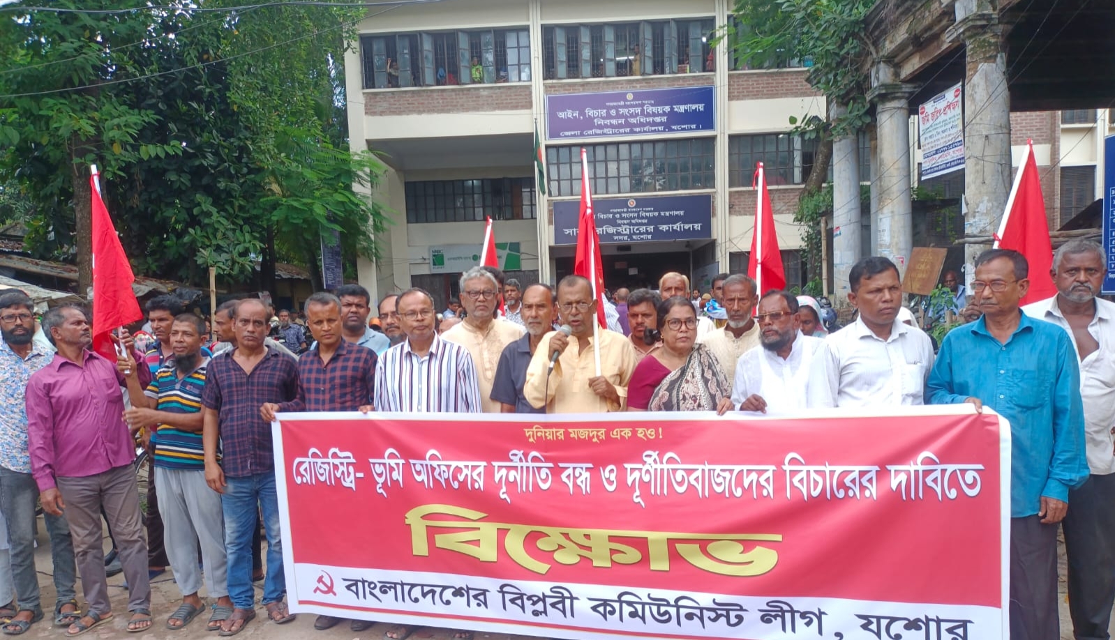 যশোর অফিস : রেজিস্ট্রি অফিস ও ভূমি অফিসের দুর্নীতির প্রতিবাদে বৃহস্পতিবার যশোর জেলা রেজিস্ট্রি অফিসের সামনে বিক্ষোভ সমাবেশ করে বাংলাদেশের বিপ্লবী কমিউনিস্ট লীগ যশোর জেলা কমিটির নেতৃবৃন্দ জমি ক্রয় বিক্রয়ে রিজিস্ট্রি অফিসের দূর্নীতি ও ভূমি অফিসের দূর্নীতি বন্ধ এবং দূর্নীতির বিচারের দাবিতে৫ সেপ্টেম্বর দুপুরে জেলা রেজিস্ট্রি অফিসের সামনে বাংলাদেশের বিপ্লবী কমিউনিস্ট লীগ যশোর জেলা কমিটি ঘন্টাব্যাপী বিক্ষোভ করে। বিক্ষোভে বক্তারা বলেন, জমি ক্রয় বিক্রয়ে সরকারি ফির থেকে ৪-৫% টাকা বেশি না দিলে রেজিস্টি হয় না। উৎকোচ দিলে নদী, খালবিল, সরকারি জমি এমন কি রেজিস্ট্রি অফিস রেজিস্ট্রি করতে ওদের বাধে না। এই উৎকোচ ও চাঁদার টাকার খাম আওয়ামী লীগের নেতা, এমপি, পাতিনেতা, আস্তান মস্তানদের নামে যেত। সেই তালিকা প্রকাশ করতে হবে, কাকে কত দেওয়া হতো প্রকাশ করতে হবে। ভূমি অফিসের দূর্নীতির চেহারাও একই। টাকা খেয়ে নদী, খাল বিল, সরকারি জমির কাগজ আপনার নামে করে দিচ্ছে। উচ্চ আদালত ভৈরব নদের কৈখালী মাথাভাঙা অংশের ১১ কি.মি. বাঁককে নদীর অংশ বলে রায় দিলেও ২১ সাল থেকে আজ অবধি ভূমি অফিস (এসি ল্যান্ড অফিস ) রিপোর্ট ডিসি অফিসে পৌছাল না।নেতৃবৃন্দ রেজিস্ট্রি অফিস ভূমি অফিসের বর্ণনা দিয়ে বলেন, বৈষম্য বিরোধী ছাত্র জনতার রক্তাক্ত অভ্যুত্থানের ভিতর দিয়ে অর্জিত নতুন বাংলাদেশে ঘুষ, দূর্নীতির কোন জায়গা থাকতে পারে না। শত শত ছাত্র জনতার জীবন দানের ভিতর দিয়ে অর্জিত দেশে বৈষম্য ঘোচাতে হবে, দূর্নীতি লুটপাট উৎক্ষাত করতে হবে। যদি সমাজে সর্বস্তর থেকে দূর্নীতি চাঁদাবাজি বন্ধ করতে না পারি, তাহ’লে আবু সাইদ, মুগ্ধরা আমাদের ক্ষমা করবে না। নেতৃবৃন্দ রেজিস্ট্রি ও ভূমি অফিসের দূর্নীতি লুটপাটের তদন্ত এবং বিচারের দাবি করেন। ঘোষ দূর্নীতি বন্ধ না হলে আগামীতে রেজিস্ট্রি ও ভূমি অফিসের সামনে ধর্না দিব। জেলা সম্পাদক ও কেন্দ্রীয় নেতা কমরেড তসলিম উর রহমানের সভাপতিত্বে বিক্ষোভ সমাবেশ বক্তব্য রাখেন কেন্দ্রীয় নেতা কমরেড জিল্লুর রহমান ভিটু, কেন্দ্রীয় নেতা ও জেলা নেতা কমরেড নাজিমউদ্দীন, জেলা নেতা কমরেড বিপুল বিশ্বাস, জেলা নেতা পলাশ বিশ্বাস, সদর উপজেলার নেতা সাহবুদ্দিন বাটুল, আসাদুজ্জামান পিল্টু, মনিরামপুরের নেতা রাজু আহমেদ প্রমুখ। কর্মসূচির শুরুতেই পার্টি অফিস থেকে একটি বিক্ষোভ মিছিল শহর প্রদক্ষিণ করে রেজিস্ট্রি অফিসে যায়।