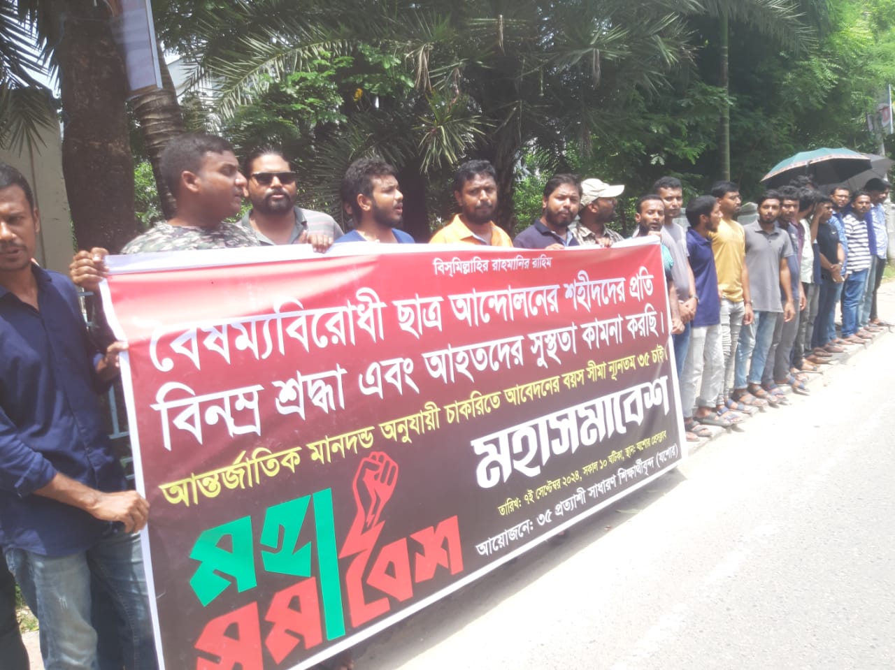 যশোর অফিস : আন্তর্জাতিক মানদন্ড অনুযায়ী সরকারি চাকরিতে বয়সসীমা ৩৫ বছর করার দাবিতে যশোরে মানববন্ধন অনুষ্ঠিত হয়েছে। আজ শনিবার সকাল সাড়ে ১১টায় সাধারণ শিক্ষার্থীদের উদ্যোগে প্রেসক্লাব যশোরের সামনে এ মানববন্ধন অনুষ্ঠিত হয়। ঘন্টাব্যাপি মানববন্ধনে শতাধিক শিক্ষার্থী অংশগ্রহণ করেন। মানববন্ধনে বক্তরা বলা হয় ,আওয়ামী স্বৈরাচার সরকারের সময় প্রকৃত মেধাবীরা মেধার যোগ্যতায় চাকরি পায়নি। সরকার দুর্নীতির মাধ্যমে বেছে বেছে ছাত্রলীগ নামধারী নেতাকর্মীদের চাকরি দিয়েছে। ফলে সরকারি চাকরিতে মেধাবীদের মূল্যায়ন করা হয়নি। অবিলম্বে প্রকৃত মেধাবীরা যাতে সরকারি চাকরিতে আবেদন করতে পারে সেজন্য চাকরিতে বয়স সীমা ৩৫ বছর করার দাবি জানানো হয় মানববন্ধন থেকে।