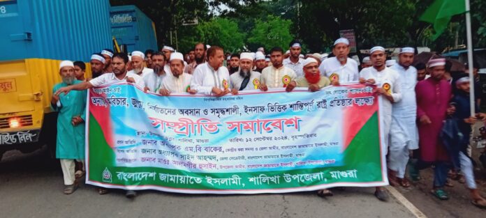 সাইফুল ইসলাম : শালিখা (মাগুরা) প্রতিনিধি : মাগুরার শালিখায় উপজেলা জামায়াতে ইসলামীর উদ্যোগে সন্ত্রাস,দুর্নীতি,অত্যাচার,অবিচার,জালাও- পুড়াও,ভাংচুর,চাঁদাবাজ,লুণ্ঠন এর প্রতিবাদে এবং ঐক্য সম্প্রীতি ও শান্তি প্রতিষ্ঠার লক্ষ্যে সম্প্রীতি সভা ১২সেপ্টেম্বর (বৃহস্পতিবার) বেলা ৩ টায় উপজেলা পরিষদ চত্বরে সম্প্রীতি সমাবেশ ও পরবর্তী গণ মিছিল অনুষ্ঠিত হয়েছে।এ সময় সমাবেশে যোগ দিতে উপজেলার বিভিন্ন ইউনিয়ন,ওয়ার্ড থেকে জামায়াতে ইসলামী ও ছাত্র-শিবিরের নেতাকর্মীরা মিছিল নিয়ে উপজেলা পরিষদ চত্বরের সামনে জড়ো হতে থাকে বেলা ৩ টায় সমাবেশ স্থল পরিপূর্ণ হয়ে জনস্রোত গড়াই যশোর-মাগুরা মহাসড়কসহ আশপাশের রাস্তায়। উপজেলা জামায়াতে ইসলামীর আমির মোঃ আলমগীর হোসেনের সভাপতিত্বে সমাবেশে প্রধান অতিথি হিসাবে বক্তব্য রাখেন,মাগুরা জেলা জামায়াতের আমির অধ্যাপক এম.বি বাকের,অন্যান্যের মধ্যে বক্তব্য রাখেন, জেলা জামায়াতের সেক্রেটারী অধ্যাপক সাইদ আহমেদ বাচ্চু,শালিখা উপজেলা জাতীয়তাবাদী দলের আহবায়ক মোঃ আনিসুর রহমান মিল্টন, জেলা জামায়াতের সহ-সেক্রেটারী আব্দুল গফফার,সহ-সেক্রেটারী মাওলানা মাহবুবুর রহমান,শ্রমিক কল্যাণ জেলা শাখার সভাপতি ও শালিখা উপজেলা সাবেক ভাইস চেয়ারম্যান অধ্যাপক ইব্রাহিম বিশ্বাস, জেলা যুব বিভাগের সভাপতি অধ্যাপক রবিউল ইসলাম, জেলা ছাত্র-শিবিরের সভাপতি মোঃ আশিক খান,অমুসলিম বিভাগের জেলা শাখার সেক্রেটারী শ্রী উত্তম কুমার বিশ্বাস, জেলা ল-ইয়ার্স কাউন্সিলের সভাপতি ফরিদ আহমেদ, শালিখা উপজেলা ব্যবসায়ী শাখার সভাপতি মোঃ নায়েব আলী বিশ্বাস, শালিখা উপজেলা ছাত্র-শিবিরের সভাপতি মোঃ আবু উবাইদা প্রমুখ । এ সময় বক্তব্যে জামায়াতের নেতাকর্মীরা বলেন, অন্যায়,অবিচার, জুলুম নির্যাতনের অবসান ও সমৃদ্ধশালী ইনসাফ ভিত্তিক শান্তিপূর্ণ রাষ্ট্র প্রতিষ্ঠার প্রতি জোর আহ্বান জানানো হয়। সমাবেশ শেষে বিশাল গণ মিছিল বের হয়। মিছিলটি উপজেলা পরিষদ চত্বর সমাবেশ স্থল থেকে উপজেলা সদর আড়পাড়া বাজারের প্রধান প্রধান সড়ক প্রদক্ষিণ করে। এসময় মিছিল থেকে জামায়াতে ইসলামীর নেতাকর্মীদের শান্তি ও সম্প্রীতি রক্ষায় বিভিন্ন ইসলামী স্লোগান দিতে দেখা যায়।