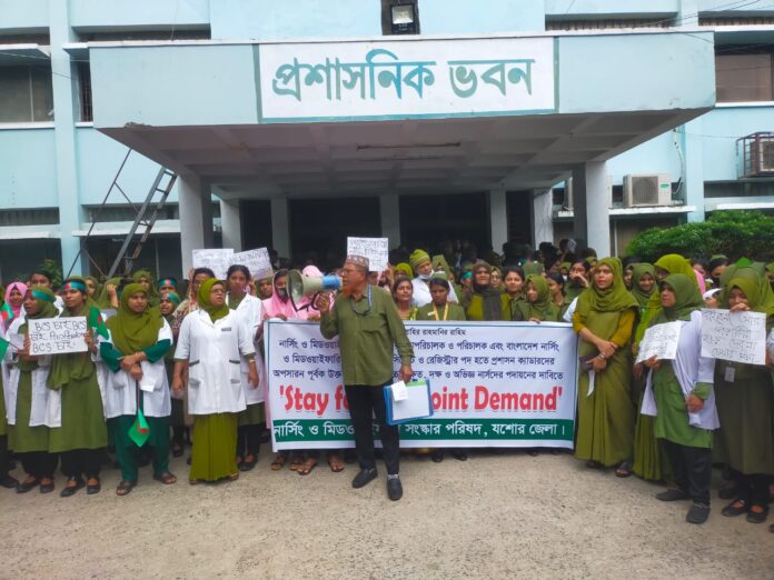 যশোর অফিস : নার্সিং ও মিডওয়াইফারি সংস্কর পরিষদ যশোরের উদ্যোগে বাংলাদেশ সরকারি কর্মকমিশনের (পিএসসি) চাকরিতে নার্সিং ক্যাডার ব্যবস্থা চালু করার দাবি জানিয়েছেন নার্সরা। সেইসঙ্গে নার্সিং ও মিডওয়াইফারি অধিদপ্তরের মহাপরিচালক, পরিচালক এবং বাংলাদেশ নার্সিং ও মিডওয়াইফারি কাউন্সিলের প্রেসিডেন্ট ও রেজিস্টার পদ থেকে প্রশাসন ক্যাডার কর্মকর্তাদের অপসারণ করার দাবি জানিয়েছেন তারা। বুধবার (১৮ সেপ্টেম্বর) বেলা ১১টা থেকে দুপুর ১২টা পর্যন্ত যশোর ২৫০ শয্যা বিশিষ্ট জেনারেল হাসপাতাল চত্বরে পতাকা মিছিল ও অবস্থান কর্মসূচি পালন করে এ দাবি জানান নার্সরা। নার্সরা বলছেন, নার্সিং অধিদপ্তরের মহাপরিচালক এবং অধিদপ্তরের পরিচালক পদগুলো নার্সদের জন্য। কিন্তু এই জায়গাগুলোতে প্রশাসন ক্যাডারের কর্মকর্তারা দখল করে রেখেছেন। নার্সিং কাউন্সিলের রেজিস্ট্রার পদে পূর্বে নার্সরা নিয়োগ পেত, কিন্তু দীর্ঘদিন যাবত নার্সদের নিয়োগ বন্ধ রেখে প্রশাসন ক্যাডারের কর্মকর্তাদের এ পদে পদায়ন করা হচ্ছে। নার্সিং ও মিডওয়াইফারি অধিদপ্তর এবং নার্সিং কাউন্সিল থেকে প্রশাসনিক ক্যাডারদের অপসারণ করে নার্সদের পদায়ন করতে হবে। বক্তব্য রাখেন, বিএনএ যশোর জেলা শাখার সভাপতি মোফাজ্জল হোসেন, যশোর নার্সিং এন্ড মিডওয়াইফারি কলেজের নাসিং ইনস্ট্রক্টর আরজিনা খাতুন, জান্নাত আরা, হাসপাতালের সিনিয়র স্টাফ নার্স তহমিনা আক্তার, বাদল সরকার প্রমুখ। কর্মসূচি প্রসঙ্গে বিএনএ যশোর জেলা শাখার সভাপতি মোফাজ্জল হোসেন জানান, বাংলাদেশের সর্বস্তরের নার্সদের এক দফা দাবি বাস্তবায়নের লক্ষ্যে আমরা এক দফা দাবি দাবিতে কর্মসূচি পালন করছি। আমরা চাই নার্সিং ও মিডওয়াইফারি অধিদপ্তরের মহাপরিচালক ও পরিচালক এবং বাংলাদেশ নার্সিং ও মিডওয়াইফারি কাউন্সিলের প্রেসিডেন্ট ও রেজিস্ট্রার পদ থেকে প্রশাসন ক্যাডার সার্ভিস কর্মকর্তাদের প্রত্যাহার করে উক্ত পদগুলোতে উচ্চ শিক্ষিত, দক্ষ ও অভিজ্ঞ নার্সদের পদায়ন করতে হবে। আন্দোলনকারী নার্সরা জানান, আগে এই দাবি মেনে নেওয়ার আশ্বাস দেওয়া হলেও ১২ সেপ্টেম্বর পুনরায় একজন নন-নার্স প্রশাসনিক কর্মকর্তাকে রেজিস্ট্রার পদে পদায়ন করা হয়েছে, যা নার্সদের ক্ষোভ আরও বাড়িয়ে দিয়েছে। তারা আরও বলছেন, এই আন্দোলন দীর্ঘায়িত হলে দেশের স্বাস্থ্যসেবা ব্যবস্থা বিপর্যয়ের মুখে পড়তে পারে বলে আশঙ্কা করা হচ্ছে। বিশেষ করে নার্সদের অভাবে রোগীদের চিকিৎসা সেবা ব্যাহত হতে পারে, যা দেশের সার্বিক স্বাস্থ্যখাতের জন্য বড় ধরনের বিপর্যয় দেখে আনতে পারে। এছাড়াও, বিক্ষোভ সমাবেশ ও মানববন্ধনে শতাধিক নার্স ও নার্সিং শিক্ষার্থীরা উপস্থিত ছিলেন। প্রসঙ্গত, গত ৮ সেপ্টেম্বর বাংলাদেশ নার্সিং ও মিড