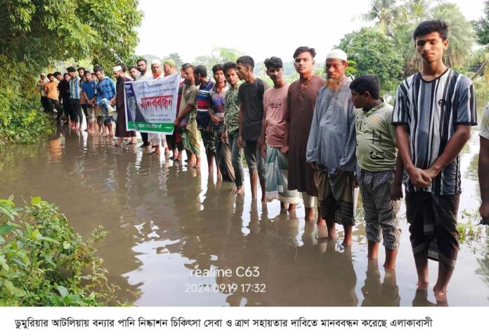 ভ্রাম্যমান প্রতিনিধি,ডুমুরিয়া (খুলনা) : খুলনার ডুমুরিয়ায় বন্যার পানি নিষ্কাশন, জরুরী ভিত্তিতে চিকিৎসা সেবা ও ত্রাণ সহায়তার দাবিতে পানির মধ্যে দাঁড়িয়ে মানববন্ধন কর্মসূচি পালন করেছে এলাকাবাসী। বৃহস্পতিবার বিকাল ৫টায় উপজেলার আটলিয়া গ্রামে ইউনিয়ন বাসীর উদ্যোগে এই মানববন্ধন কর্মসূচি পালিত হয়।