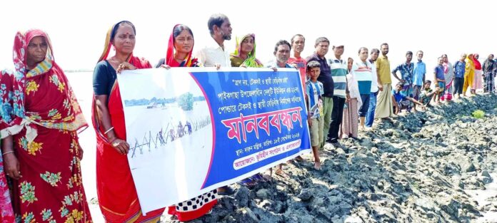 পাইকগাছা প্রতিনিধি :””ত্রান নয় টেকসই ও স্থায়ী বেড়িবাঁধ চাই” শ্লোগানে পাইকগাছা উপজেলাধীন দেলুটি ইউনিয়নের ২২ নং পোল্ডারে টেকসই ও স্থায়ী বেড়িবাঁধ নির্মাণের দাবিতে ব্যানারসহ র্যালি, মানববন্ধন ও আলোচনা সভা অনুষ্ঠিত হয়েছে। বুধবার সকাল ১১ টার দিকে দেলুটির দারুন মল্লিকে ভূমিহীন সংগঠন ও এলাকাবাসীর আয়োজনে শত শত নারী-পুরুষের উপস্থিতিতে ভাঙনের স্থানে টেকসই ও বেড়িবাধ নির্মাণের দাবিতে ব্যানারসহ র্যালি, মানববন্ধন ও আলোচনা সভা হয়। উক্ত মানববন্ধনে সভাপতিত্ব করেন দেলুটি ইউনিয়ন ভূমিহীন কমিটির সভাপতি শেখ শহিদুল ইসলাম। বক্তৃতা করেন, ভূমিহীন নেত্রী মনোয়ারা বেগম, রিতা মন্ডল, ভূমি নেতা নিরাপদ দফাদার, ইব্রাহিম গাজী, রুহুল আমিন গাজী, সিপিবি নেতা শিশির কুমার মন্ডল,নিজেরা করির পক্ষ থেকে বিভাগীয় সংগঠক কামাল হোসেন, অঞ্চল সমন্বয়ক সাহাদুল ইসলাম। এসময় শত শত স্থানীয় এলাকাবাসী উপস্থিত ছিলেন। উল্লেখ্য, ২২ আগস্ট বৃহস্পতিবার বেলা ১২টার দিকে জোয়ারে ভদ্রা নদীর অতিরিক্ত পানি বৃদ্ধি পেয়ে উপজেলার দেলুটি ইউনিয়নের ২২নং পোল্ডারের কালিনগর বাওয়ালি বাড়ির দক্ষিণ পাশের ৩শ’ ফুটের বেশি এলাকা জুড়ে ওয়াপদার বাঁধ (রাস্তা) ভেঙে লোকালয় প্লাবিত হয়। স্থানীয় এলাকাবাসী স্বেচ্ছাশ্রমে এবং উপজেলা প্রশাসন, পাউবোর উদ্যোগে এক সপ্তাহের চেষ্টায় ভাঙ্গনের স্থানে বাঁধ নির্মাণ করা হয়। কিন্তু ১৬.০৯.২৪ তারিখে আবারও দারুণ মল্লিক গ্রামে ওয়াটার স্লুইচগেট সংলগ্ন প্রায় ৩শ ফুটের বেশি বেড়িবাঁধে ফাটলসহ জোয়ারের পানি প্রবেশ করলে ভূমিহীন সংগঠন, এলাকাবাসী ও পাউবোর উদ্যোগে তাৎক্ষণিক মেরামত কার্যক্রম শুরু করে এবং মেরামত কাজ চলমান রয়েছে।