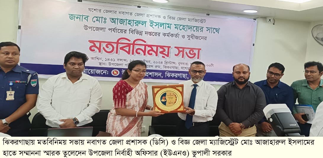 যশোর স্পেশাল ঝিকরগাছায় মতবিনিময় সভায় নবাগত জেলা প্রশাসককে সম্মাননা স্মারক দিলেন ইউএনও ভুপালী সরকার...