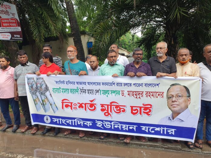 যশোর স্পেশাল আমারদেশ সম্পাদক মাহমুদুর রহমানের নিঃশর্ত মুক্তির দাবিতে যশোরে সংবাদকর্মীদের মানববন্ধন