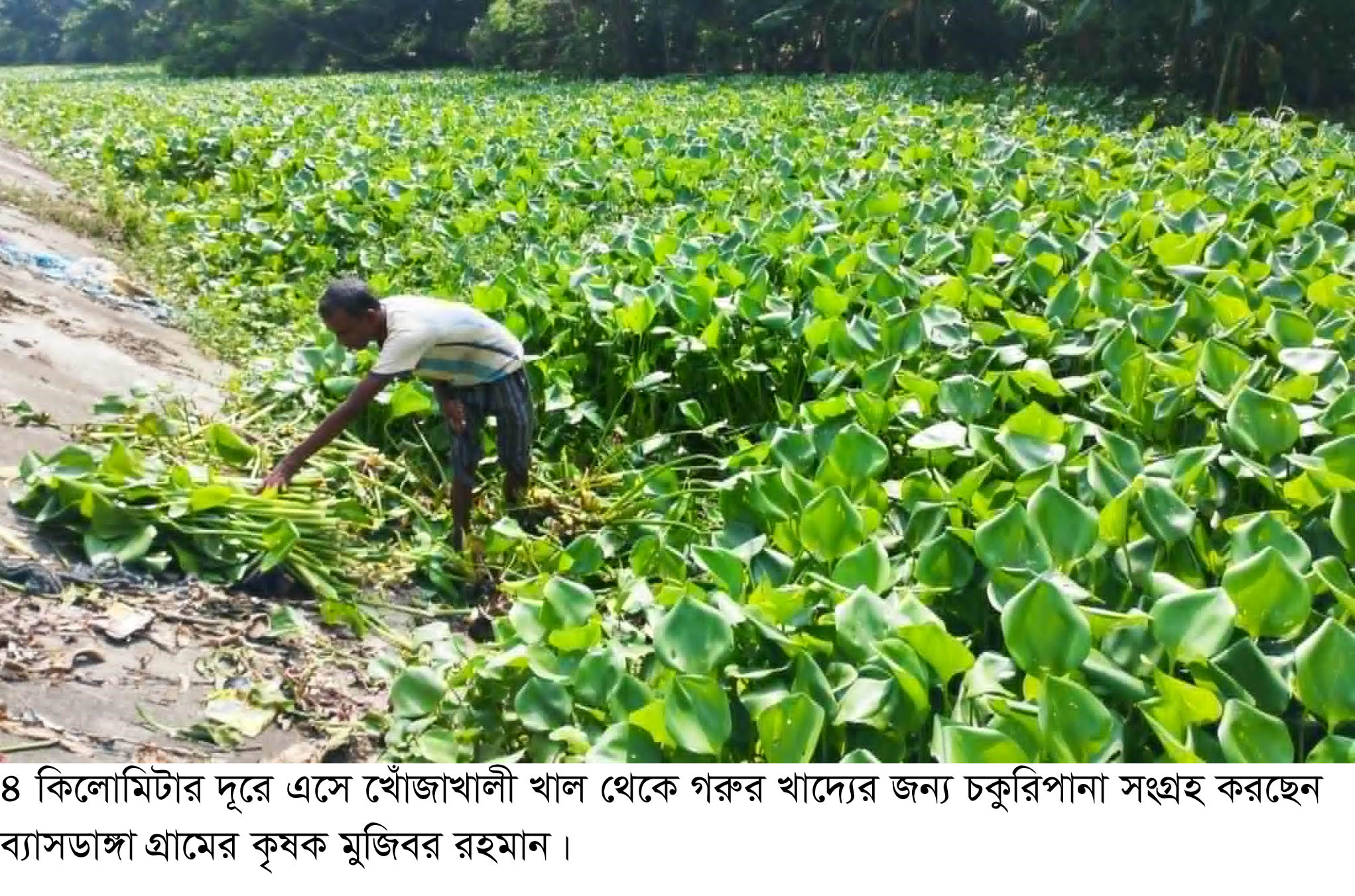থেকে কচুরিপানা সংগ্রহ করতে হচ্ছে। যশোর-চুকনগর সড়কের মধ্যকুল এলাকায় ঘাস কাটার