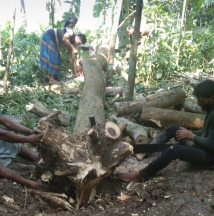 লোহাগড়া(নড়াইল)প্রতিনিধি : নড়াইলের লোহাগড়ার পারশালনগর গ্রামে মৃত পুলিশ সদস্য মোঃ নজরুল ইসলামের প্রায় ৫লাখ টাকা মূল্যের ৮টি রেইনট্রি ও মেহেগনি গাছ কেটে নিয়েছে প্রভাবশালীরা। জানা যায়, রবিবার সকালে হাজিপাড়া বাতাসী গ্রামের উবায়দুর শেখের ছেলে মোঃ শহিদুল শেখ, ইব্রাহিম মোল্যার ছেলে রবিউল আলমের নেতৃত্বে ৪/৫ জনে ৩৯নং পারশালনগর মৌজার হাল ৮৬৮নং দাগের মৃত পুলিশ সদস্যর নজরুল ইসলামের পিতা আব্দুল মজিদ মোল্যার নিজ নামীয় দলিল রেকর্ডীয় ১৩শতক জমির মধ্যে ৮ দশমিক ৬৬শতক জমি ওয়ারেশ সূত্রে প্রাপ্ত হন মৃত নজরুল ইসলাম। রবিবার ওই জমি থেকে দূর্বৃত্তরা গাছ কেটে ফেলে। গাছ কাটার প্রতিবাদ করায় দূর্বৃত্তরা মৃত নজরুল ইসলামের ছেলে মোঃ আব্দুল্লাহ আল মামুন কে হুমকি প্রদান করে ভয়ভীতি দেখিয়ে গাছ নিয়ে যায়।