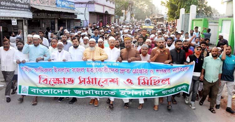 জেলা প্রতিনিধি, যশোর : যশোরে জামায়াত কর্মী আমিনুল ইসলাম সজল হত্যার প্রতিবাদে এবং খুনিদের গ্রেফতারের দাবিতে বিক্ষোভ মিছিল ও সমাবেশ করেছেন সংগঠনের নেতাকর্মীরা। বুধবার (৬ নভেম্বর) বিকেলে শহরের মুজিব সড়কস্থ জেলা আইনজীবী সমিতির সামনে এই সমাবেশ হয়।