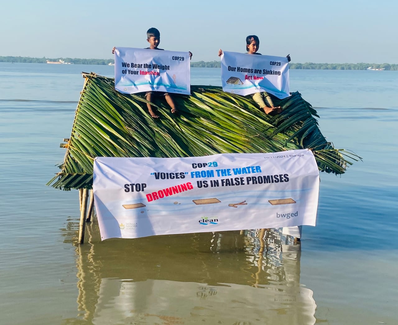 ১০ নভেম্বর রবিবার সকালে মোংলার দক্ষিণ কাইনমারির পশুর নদের পাড়ে বৈশ্বিক সচেতনতা এবং স্থানীয় ক্ষতিগ্রস্ত জনগোষ্ঠীর সাথে সংহতি রাখার অনুপ্রেরণামূলক প্রয়াসে মোংলা নাগরিক সমাজ (এমএনএস), কোস্টাল লাইভলিহুড অ্যান্ড এনভায়রনমেন্টাল অ্যাকশন নেটওয়ার্ক (ক্লিন), এবং বাংলাদেশ ওয়ার্কিং গ্রুপ অন ইকোলজি অ্যান্ড ডেভেলপমেন্ট (বিডাবিøউজিইডি) যৌথভাবে এই গুরুত্বপূর্ণ প্রচারাভিযানের আয়োজন করে। প্রচারাভিযানের অংশ হিসেবে বাংলাদেশের দক্ষিণ উপকূলীয় অঞ্চলে সমুদ্রপৃষ্ঠের উচ্চতা বৃদ্ধির তীব্র সংকটকে কেন্দ্র নদীর পানিতে নিমজ্জিত বাড়ির পরিবারের শিশুরা ব্যানার পেস্টুন হাতে নিয়ে অভিনব প্রতিবাদ জানায়।