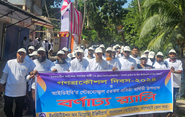 বাগেরহাট প্রতিনিধি : “বৈষম্যহীন কর্মত্রে সময়ের দাবী” এই প্রতিপাদ্যকে সামনে রেখে বাগেরহাটে “গনপ্রকৌশল দিবস ২০২৪ ও ইনস্টিটিউশন অব ডিপ্লোমা ইঞ্জিনীয়ার্স বাংলাদেশ (আইডিইবি’র) ৫৪তম প্রতিষ্ঠা বার্ষিকা পালিত হয়েছে। রবিবার (১০ নভেম্বর) সকালে ইনস্টিটিউশন অব ডিপ্লোমা ইঞ্জিনীয়ার্স বাংলাদেশ (আইডিইবি) বাগেরহাট জেলা শাখার উদ্যেগে আইডিইবি বাগেরহাট জেলা শাখার কার্যালয়ের সামনে থেকে এক বর্ণাঢ্য র‌্যালি শুরু হয়ে শহরের প্রধান প্রধান সড়ক অতিক্রম করে বাগেরহাট কেন্দ্রীয় শহীদ মিনারের সামনে শেষ হয়। পরে বাগেরহাট কেন্দ্রীয় শহীদ মিনারের সামনে সংপ্তি আলোচনা সভা অনুষ্ঠিত হয়।