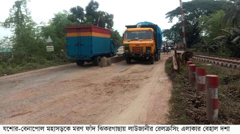 বিপজ্জনক রেলক্রসিং। যশোর-বেনাপোল মহাসড়কের দুপাশেই বিভিন্ন স্থানে বিটুমিনের কার্পেটিং উঠে ও বসে গিয়ে ছোট বড় অনেক গর্তের সৃষ্টি হয়েছে। এ