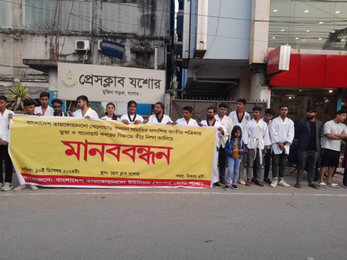 যশোর অফিস : বিকেএসপির মহাপরিচালকের অপসারণ দাবি করে বিভিন্ন বিভিন্ন পত্রিকায় সংবাদ প্রকাশের প্রতিবাদ জানিয়ে মানববন্ধন করেছে তায়কোয়ানদো যশোর জেলা শাখা। গত মঙ্গলবার বিকেলে প্রেসক্লাব যশোরের সামনে এ মানববন্ধন কর্মসূচি পালিত হয়েছে। মানববন্ধনে উপস্থিত ছিলেন খুলনা বিভাগীয় তায়কোয়ানদো ইউনিয়ন এর সভাপতি ও বিভাগীয় প্রধান প্রশিক্ষক এসকে ওয়ালিউর রহমান, সাধারণ সম্পাদক ও সহকারী প্রধান প্রশিক্ষক তবিবুর রহমান,বৈষম্য বিরোধী ছাত্র আন্দোলনের যশোর জেলা শাখার প্রধান সম্মনয়ক রাশেদ খান,অন্তরাসহ অন্যান্য নেতৃবৃন্দ। এছাড়া বাংলাদেশ তায়কোয়ানদো ইউনিয়ন যশোর জেলা শাখার শিক্ষার্থীরা উপস্থিত ছিলেন। বিকেএসপির মহাপরিচালক ব্রিগেডিয়ার জেনারেল মনিরুল ইসলামের বাংলাদেশ তাইকোয়ান্দো ইউনিয়নের খেলোয়াড়দের নিয়ে আন্তর্জাতিক খেলায় অংশগ্রহণ প্রকাশিত সংবাদটি মিথ্যা, বানোয়াট এবং বিভ্রান্তিমূলক। পত্রিকার রিপোর্টে উল্লেখিত ৫ ই আগস্টে মুমিত হাসান ব্রাইটের অফিস ভাংচুর হয়েছে বলা হয়েছে, তবে এমন কোন ঘটনাই ঘটেনি, বিষয়টি ছিল মিথ্যা ও ভিত্তিহীন।
