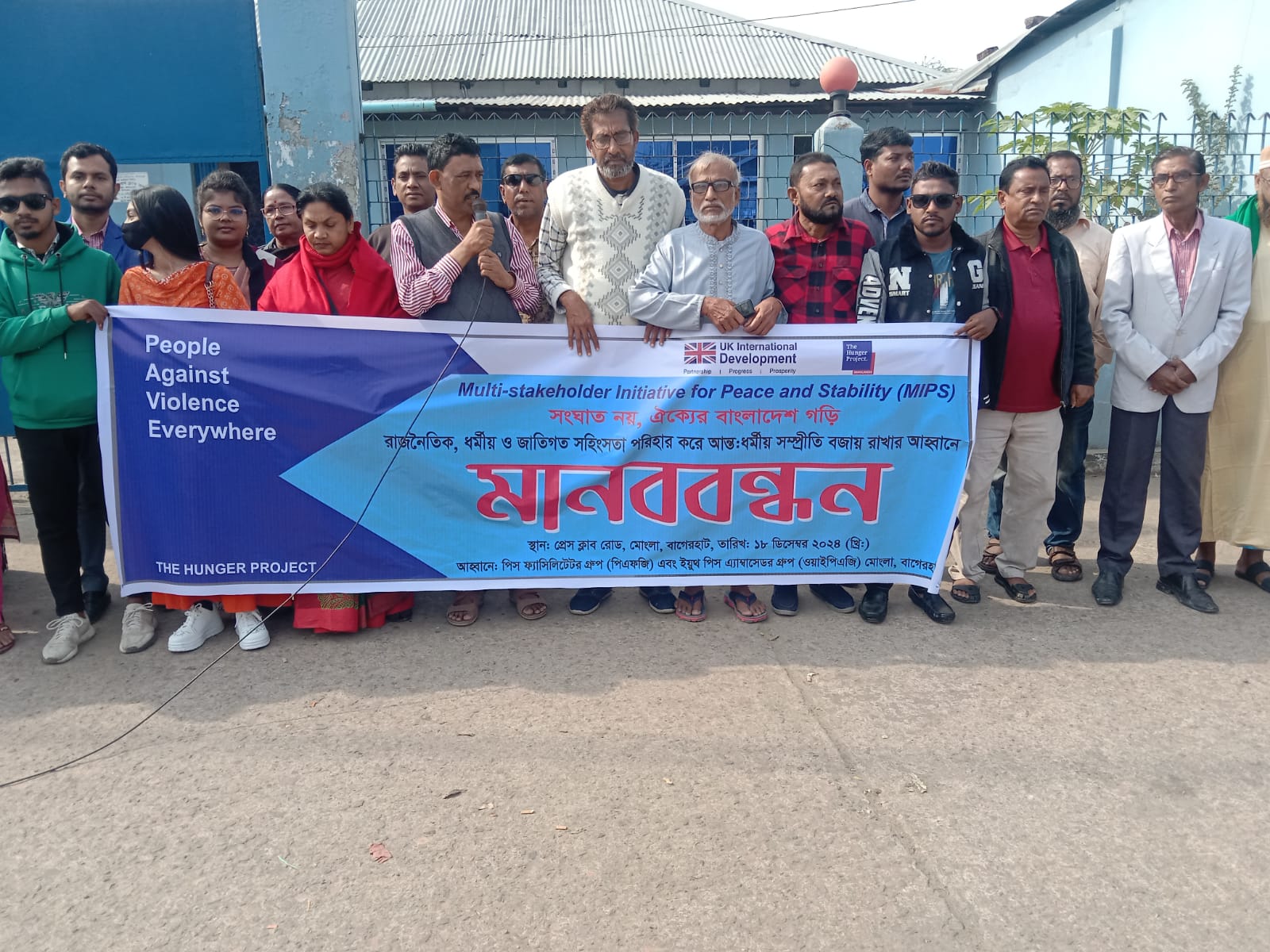 বুধবার (১৮ ডিসেম্বার ) সকালে বাগেরহাটের মোংলা প্রেসক্লাবের সমানে মানববন্ধনে এমন দাবি জানানো হয় । তারা বলেন, একটি শান্তিপূর্ণ, সমৃদ্ধ ও গণতান্ত্রিক বাংলাদেশ গড়ে তোলার আহ্বানে সংঘাত নয়-ঐক্যের বাংলাদেশ গড়ি, সহিংসতা বন্ধ করি, সম্প্রীতির বাংলাদেশ গড়ি, সম্প্রীতির পথে, এগিয়ে চলি একসাথে, ধর্মীয় সম্প্রীতি বজায় রাখি, শান্তি ও সম্প্রীতির বাংলাদেশ গড়ি, গণতান্ত্রিক চেতনা লালন করি, শান্তি ও সম্প্রীতির বাংলাদেশ গড়ি উপরোক্ত শ্লোগানের আলোকে দি হাঙ্গার প্রজেক্ট বাংলাদেশ ও এমআইপিএস প্রকেল্পের সহযোগিতায় এবং পিস ফ্যাসিলিটেটর গ্রুপ (পিএফজি) এবং ইযৃথ পিস এ্যাম্বাসেডর গ্রুপ (ওয়াইপিএজি) আয়োজিত মানববন্ধন কর্মসূচি উদযাপন করা হয়।