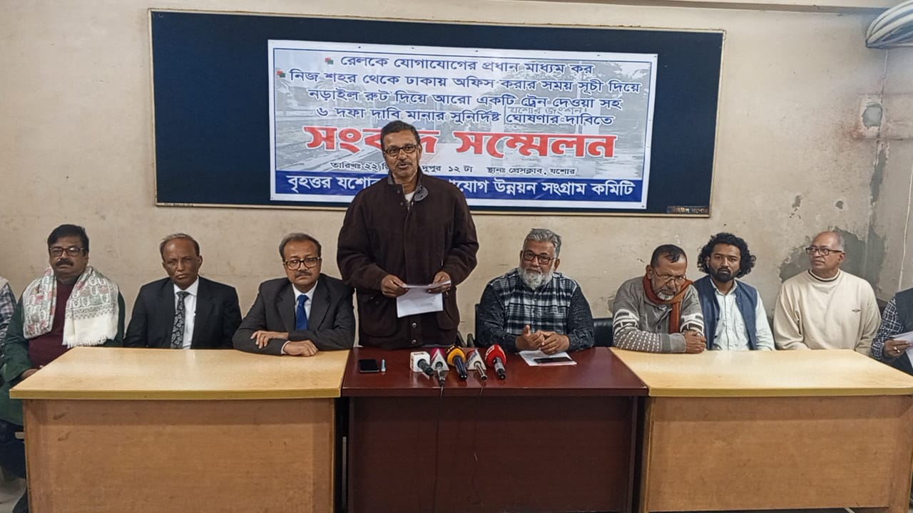যশোর প্রতিনিধি : পদ্মা সেতু হয়ে স্বল্প সময়ে যশোর থেকে ঢাকায় যাওয়া, রেলকে যোগাযোগের প্রধান মাধ্যমসহ ৬ দফা দাবিতে সংবাদ সম্মেলন করেছে বৃহত্তর যশোর রেল যোগাযোগ উন্নয়ন সংগ্রাম কমিটি। রোববার দুপুরে প্রেসক্লাব যশোরে এই সংবাদ সম্মেলন করে। এসময় ২৪ ডিসেম্বর পদ্মাসেতু রেল লিংক প্রকল্প উদ্বোধনের দিন জেলা প্রশাসকের মাধ্যমে রেল উপদেষ্টা বরাবর স্মারকলিপি প্রদান ও রেল স্টেশনে বিক্ষোভ কর্মসূচি ঘোষণা করেন।