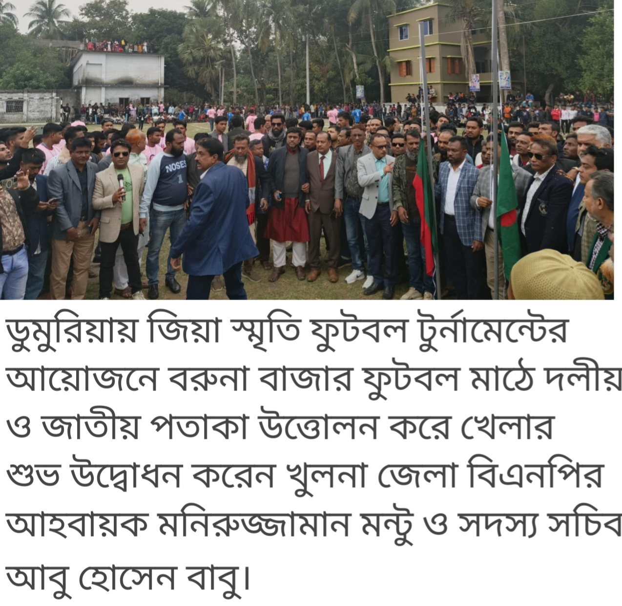 ভ্রাম্যমান প্রতিনিধি, ডুমুরিয়া (খুলনা)। ডুমুরিয়ায় জাতীয়তাবাদী যুবদল, স্বেচ্ছাসেবক দল ও ছাত্রদল ধামালিয়া ইউনিয়ন শাখার আয়োজনে শহীদ জিয়া স্মৃতি ফুটবল টুর্নামেন্টের ফাইনাল খেলা অনুষ্ঠিত হয়েছে। বুধবার বিকেলে বরুনা বাজার ফুটবল মাঠে চুড়ান্ত পর্বের খেলায় অংশগ্রহণ করেন খুলনার সানরাইজ ফুটবল একাদশ বনাম বাগেরহাট রয়েল বেঙ্গল টাইগার ফুটবল একাদশ। নির্ধারিত সময়ের মধ্যে খুলনা ১-০ গোলে বাগেরহাটকে পরাজিত করে চ্যাম্পিয়ন হয়।খেলায় ধারা বর্ণনায় ছিলেন রফিকুল ইসলাম।