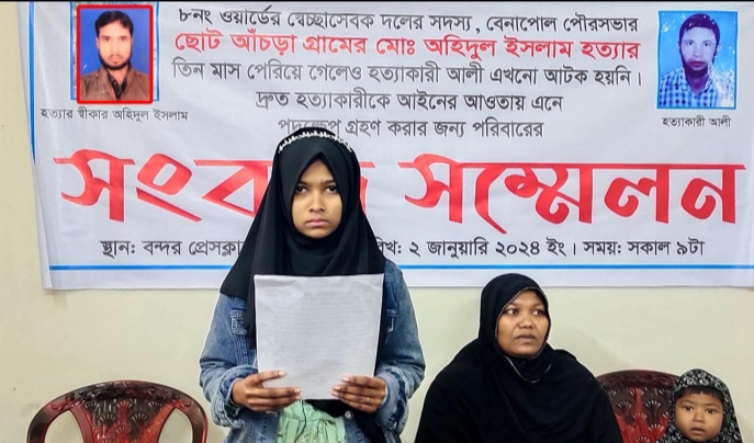 পেরিয়ে গেলেও এখনও পুলিশ কাউকে আটক করতে পারিনি। তাই প্রশাসনের কাছে জোর দাবি আমার বাবার হত্যার আসামিকে দ্রুত আটক করে,বিচার দাবি জানাচ্ছি। বেনাপোল বিএনপি কর্মী অহিদুল হত্যায় আসামীদের আটকের দাবিতে সংবাদ সম্মেলন