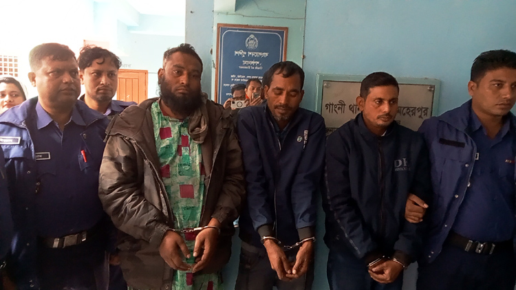 গ্রেফতারকৃতরাহচ্ছে- চৌগাছা গ্রামের রইচ উদ্দিনের ছেলে রবিউল ইসলাম ওরফে বিপ্লব (৩৬), বাঁশবাড়িয়া পশ্চিমপাড়ারআব্দুল আউয়ালের ছেলে মফিকুল ইসলাম(৩৯) ও কোদাইলকাটি গ্রামের জামাত আলীর ছেলে আলমগীর হোসেন(৪০)। গ্রেফতার ৩ জনকেআজ শুক্রবার সকালে গাংনী থানায় হস্তার করা হলে বিকেলে পুলিশ তাদেরকে মেহেরপুর আদালতেপ্রেরণ করে।