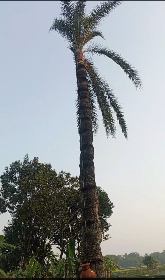 জাহিদ,ভ্রাম্যমান প্রতিনিধিঃ- মনিরামপুর উপজেলার জয়পুর সহ কয়েকটি গ্রামে অভিনব পদ্ধতিতে খেজুরের রস সংগ্রহ করছে গাছিরা।বড় বড় খেজুরের গাছের মাথায় নলিতে রশি দিয়ে টানা বেধে গাছের নিচে মাটির কলসি(ভাড়) বেধে রাখছেন আর রশি বেয়ে রস মাটির কলসিতে জমছে।এলাকার গাছিরা বলেন লম্বা গাছ থেকে রস সংগ্রহ করা ঝুকিপূর্ন এবং সময় সাপেক্ষ ব্যাপার এবং এই শীতে গাছে উঠতে যেয়ে পা পিছলে পড়ে গেলে ঘটতে পারে দূর্ঘটনা তাই ঝামেলা এড়াতে নলিতে রশি বেধে গাছের গোড়ার দিকে সুবিধাজনক স্হানে ভাড় পেতে রাখা হয় ফলে রশি বেয়ে গড়িয়ে রস ভাড়ে এসে জমা হয় নির্দিষ্ট সময়ের পর ভাড় থেকে গাছিরা রস সংগ্রহ করে অল্প সময়ের মধ্যেই পুনরায় গাছে মাটির কলসি পেতে রাখেন।এই পদ্ধতিতে সহজেই গাছিরা রস সংগ্রহ করতে পারে।এ পদ্ধতি ব্যাবহার করা হয় বড় বড় খেজুর গাছের ক্ষেত্রে।শেখপাড়া খানপুর গ্রামের মাহবুর হোসেন বলেন এরকম পদ্ধতিতে রস সংগ্রহ করতে পূর্বে কখনো দেখিনি এই পদ্ধতিতে রস সংগ্রহ করা গাছিদের জন্যে নিরাপদ বলে আমি মনে করি।