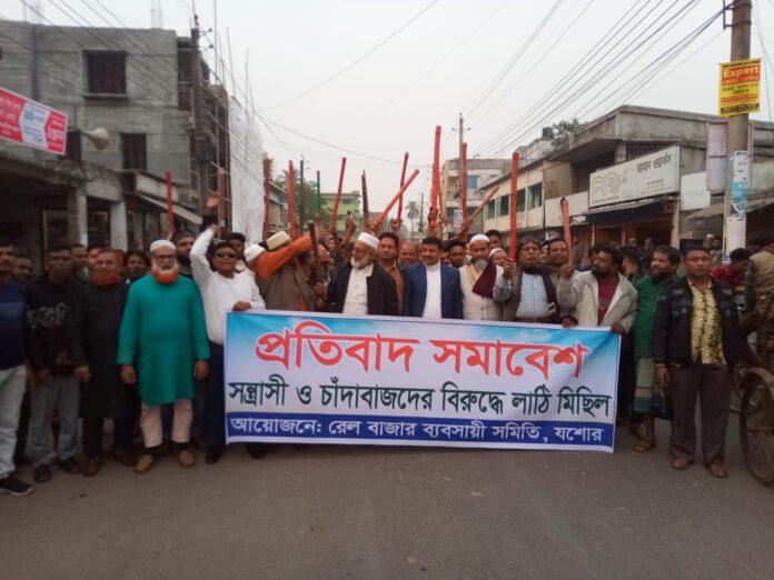 যশোর স্পেশাল যশোরে সন্ত্রাসী ও চাঁদাবাজদের বিরুদ্ধে যশোর রেলবাজার এলাকার ব্যবসায়ীদের লাঠি মিছিল