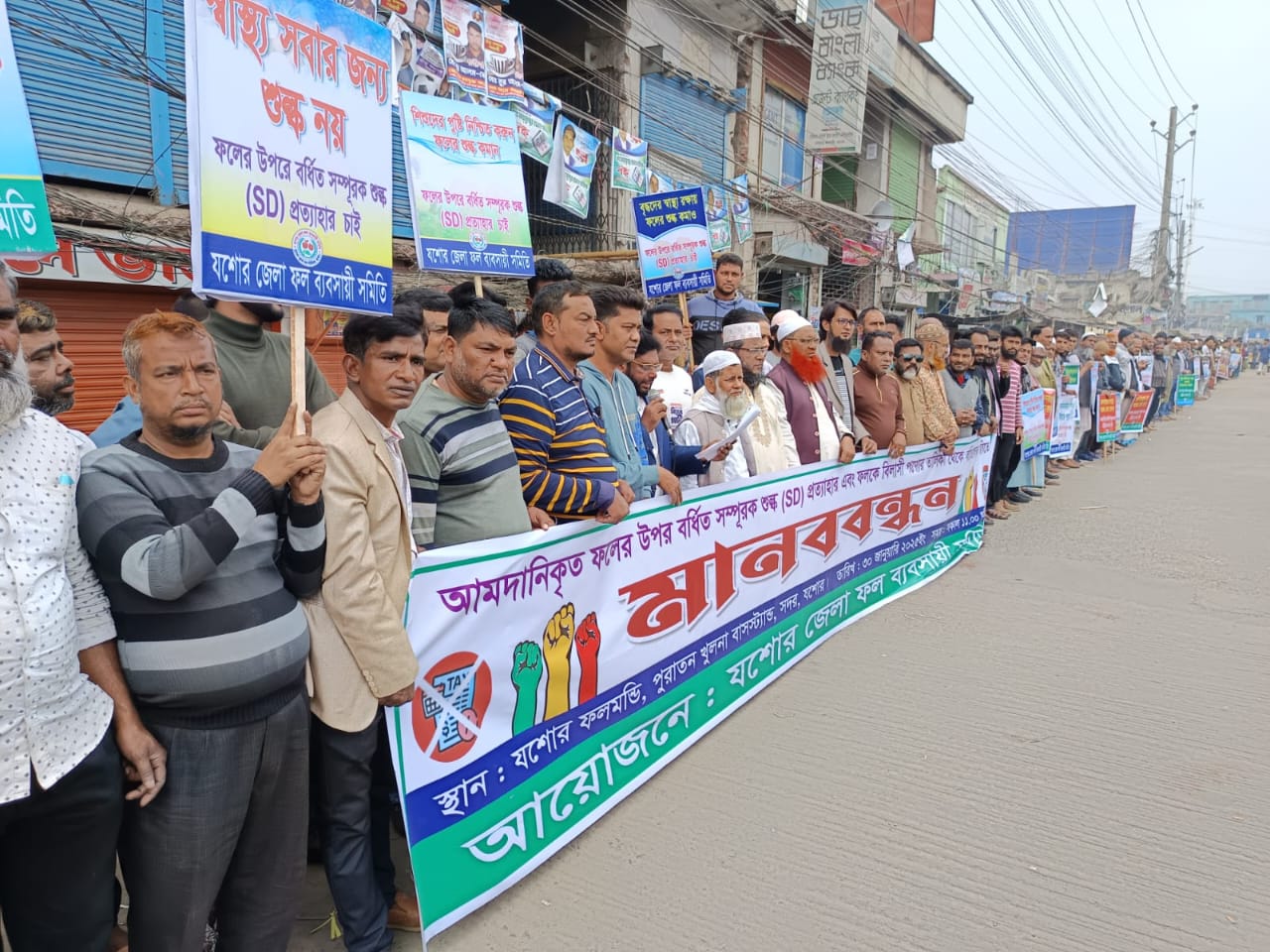 ফলজাতীয় পণ্যের অতিরিক্ত রাজস্ব প্রত্যাহারে দাবিতে যশোরের ফল ব্যবসায়ীদের মানববন্ধন