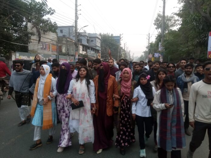 বৈষম্য বিরোধী ছাত্র আন্দোলনের আহ্বায়ক মোঃ রাশেদ খান এর নেতৃত্বে বিক্ষোভ মিছিলে শান্তিপূর্ণভাবে অনুষ্ঠিত হয়।