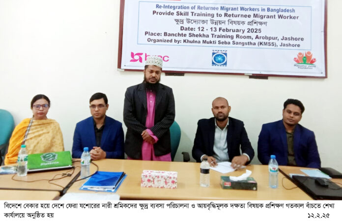যশোর অফিস : করোনাকালীন সময়ে বিদেশে বেকার হয়ে দেশে ফেরা যশোরের নারী শ্রমিকদের ক্ষুদ্র ব্যবসা পরিচালনা এবং আয়বৃদ্ধিমূলক দক্ষতা বিষয়ক প্রশিক্ষণ অনুষ্ঠিত হয়েছে। খুলনা মুক্তি সেবা সংস্থা (কেএমএসএস) ‘রি-ইন্টিগ্রেশন অব রিটার্নি মাইগ্রান্ট ওয়ার্কারস ইন বাংলাদেশ’ (আরআরএমডাব্লুবি) প্রকল্পের মাধ্যমে যশোর বাঁচতে শেখায় দুই দিনব্যাপী এ প্রশিক্ষণের আয়োজন করে। প্রকল্পের প্রোগ্রাম ম্যানেজার জাকিয়া সুলতানার সভাপতিত্বে অনুষ্ঠানে অতিথি হিসেবে বক্তব্য রাখেন ওয়েল আনার্স কল্যাণ বোর্ড যশোরের সহকারী পরিচালক ফসিউল আলম এবং কর্মসংস্থান ও জনশক্তি অফিস যশোরের সহকারী পরিচালক শাহারিয়ার হোসেন। প্রশিক্ষক হিসেবে ছিলেন কৃত্রিম প্রজনন কেন্দ্র যশোরের সায়েন্টিফিক অফিসার মেহেদী হাসান ও যুব উন্নয়ন অধিদপ্তর যশোরের ইন্সট্রাক্টর মো. আসাদুজ্জামান। উপস্থিত ছিলেন খুলনা মুক্তি সেবা সংস্থার প্রজেক্ট অফিসার উৎপল রায়, ভলেন্টিয়ার অঞ্জনা পাল ও সাদিয়া আফরিন নাতাশা।