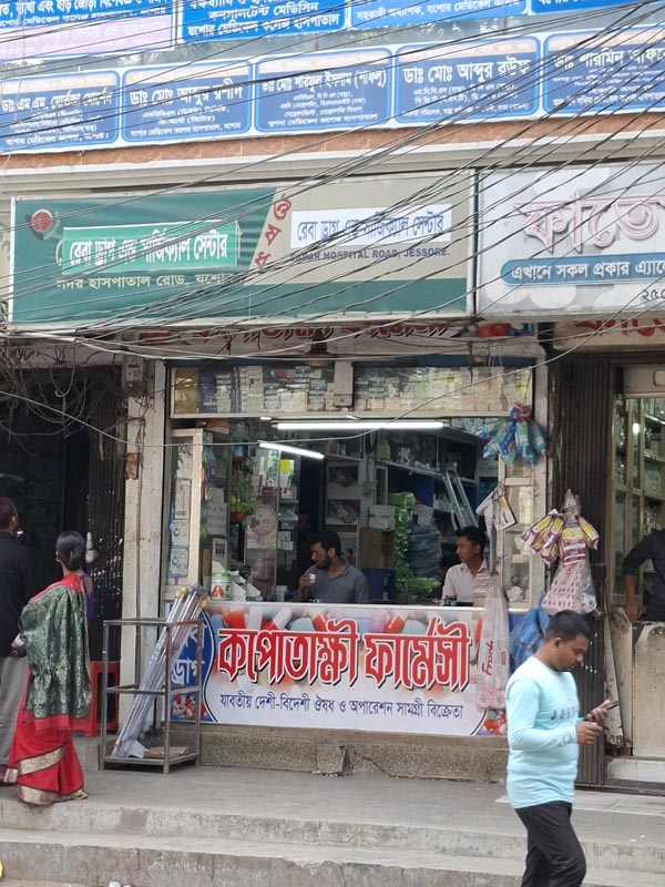 হাসপাতালে প্রধান গেটের বিপরীতে কপোতাক্ষী ফার্সেসী ও রেবা ড্রাগ এন্ড সার্জিক্যাল সেন্টার নামক দোকানটি আরিফুল ইসলাম সাগর নামে একজন ব্যক্তির। উক্ত প্রতিষ্ঠানের সামনের অংশের মুখে উত্তর দিকে বেচাকেনার প্রধান অংশ। প্রতিষ্ঠানের সামনের অংশের নীচে ফার্নিচারের (কাঠে) ও তার ওপর অংশের টিনে প্রদর্শনকৃত সাইবোর্ডের স্থানে কপোতাক্ষী ফার্মেসী লেখা রয়েছে।তবে প্রতিষ্ঠানের সামনে ভবনের দেওয়ালের উপরের অংশে প্যানা করে লেখা রয়েছে রেবা ড্রাগ এন্ড সার্জিক্যাল সেন্টার। শুধু তাই নয় উক্ত প্রতিষ্ঠানের পূর্ব অংশে সামনে থেকে দক্ষিণ দিকের শেষ অংশ পর্যন্ত রেবা ড্রাগ এন্ড সার্জিক্যাল সেন্টার লেখা ছিল। তবে খোজ নিয়ে জানাগেছে, গত ১২ ও ১৩ ফেব্রুয়ারী যে কোন সময় উক্ত প্রতিষ্ঠানের মালিকের নির্দেশে পূর্ব অংশের সামনের দিকে প্যানায় লেখা রেবা ড্রাগ এন্ড সার্জিক্যাল সেন্টার তুলে ফেলা হয়েছে। ওই অংশে ১৫ ফেব্রুয়ারী থেকে ১৭ ফেব্রুয়ারী পর্যন্ত সাদা বেষ্টিত টিনের অংশ দেখা গেছে। যাতে কোন কিছু লেখা নেই।