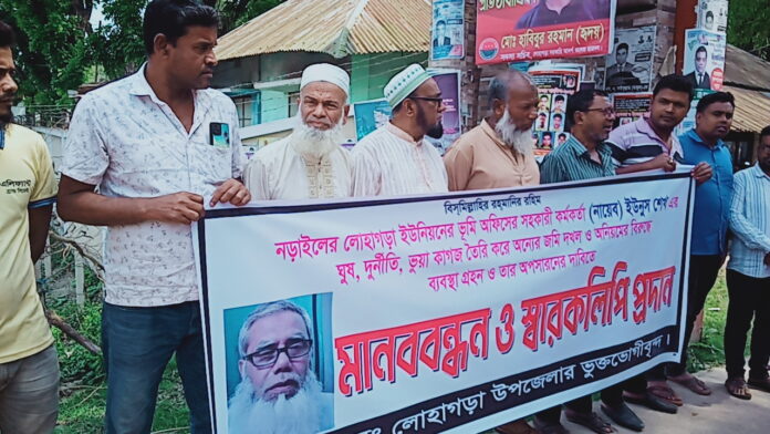 রবিবার (২৩ মার্চ ) সকালে লোহাগড়া উপজেলা চত্বরে এ মানববন্ধন অনুষ্ঠিত হয়। এতে ভুক্তভোগী সাধারণ জনগণ, স্থানীয় সচেতন নাগরিক, কৃষক ও ব্যবসায়ীরা অংশ নেন। মানববন্ধনে বক্তারা অভিযোগ করেন, নায়েব ইউনুস দীর্ঘদিন ধরে জমির নামজারি, খারিজ ও পর্চা সংশোধনের মতো গুরুত্বপূর্ণ কাজে ঘুষ ছাড়া কোনো ফাইলই এগিয়ে নেন না।