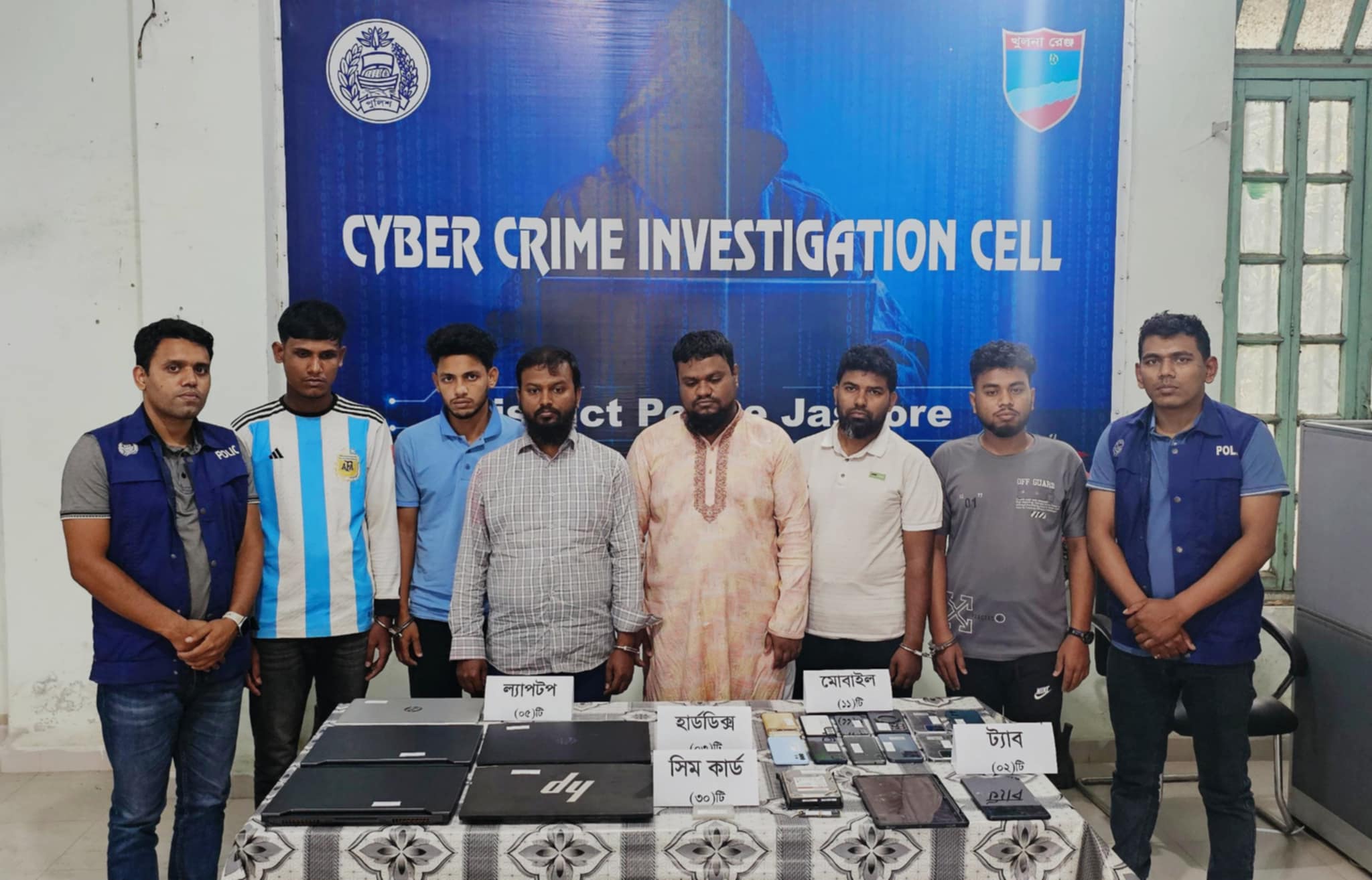 একই সাথে তাদের কাছথেকে উদ্ধার হয়েছে জুয়ার কাজে ব্যবহৃত ৫টি ল্যাপটপ, ১০ টি মোবাইল ফোন, দুইটি ট্যাব, তিনটি হার্ডডিস্ক, ৩০ টি মোবাইল সিম, বিকাশের এজেন্ট একাউন্টে থাকা দুইলাখ ৬৩ হাজার টাকা। আটককৃতরা হলেন, ঝিকরগাছা উপজেলার লাউজানী গ্রামের আব্দুর রাজ্জাকের দুই ছেলে নাজমুল ওয়াহিদ মিল্লাত ও নাজমুল শাহাদৎ,শার্শা উপজেলার বাগুরী গ্রামের হাবিবুর রহমানের ছেলে মাহাবুবুর রহমান মাসুম, সাতক্ষীরা জেলা সদর উপজেলার আমতলা গ্রামের আনারুল ইসলামের ছেলে আসাদুল ইসলাম, একই গ্রামের মনিরুল হুদার ছেলে মোহাম্মদ জাহিদ হাসান এবং যশোর সদর উপজেলার বড় মেঘলা গ্রামের আলমগীরের ছেলে তারেক রহমান।