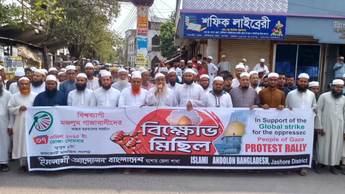 যশোর অফিস : ফিলিস্তিনের গাজায় চলমান ইসরাইলি আগ্রাসন ও গণহত্যার প্রতিবাদে ইসলামী আন্দোলন বাংলাদেশ যশোর জেলা শাখার উদ্যোগে এক বিক্ষোভ সমাবেশ ও মিছিল অনুষ্ঠিত হয়েছে। জেলা শাখার সভাপতি মুহাম্মাদ আব্দুল হালিম মিঞার সভাপতিত্বে এবং সেক্রেটারি মোহাম্মদ আলী সরদারের সঞ্চালনায় এ কর্মসূচি অনুষ্ঠিত হয়।