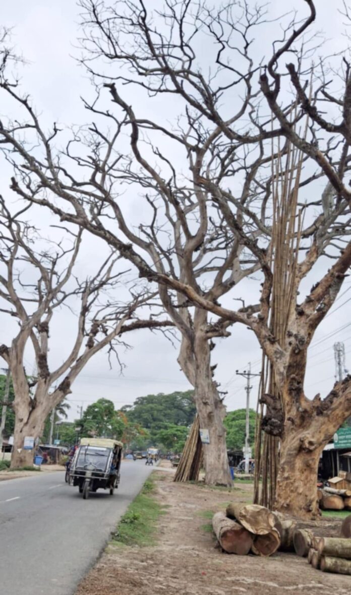 শহিদুল ইসলাম:- যশারের শার্শা উপজলার শার্শা- নাভারন – সাতক্ষীরা মহাসড়কের দু পাশে মৃত প্রায় অর্ধশত রােড রেন্ট্রি শিশু গাছ দীর্ঘ দিন ধরে ঝুকি পূর্ণ হলেও সড়ক ও জনপথ বিভাগের কােন নজর নেই। অবিলম্বে এসব অর্ধ মৃত বা পরিপূর্ন মৃত গাছ গুলি অপসারন না করলে যে কােন মুহুর্তে বড় ধরনের দূর্ঘটনা ঘটতে পারে। হতাহত হতে পারে পথের যাত্রি বাহী বাস, ট্রাক, নছিমন, করিমন,জে এস এ ও ইজি বাইকের যাত্রীরা। এ ব্যাপারে স্থানীয় ও জাতীয় পত্রিকায় একাধিক বার সংবাদ প্রকাশ করা হলেও কােন প্রতিকার হয়নি। যে কারনে হালকা ঝড় বা হাওয়া হলেই এসব মরা গাছের পঁচা ডাল রাস্তার উপর ভেঙ্গে পড়ে প্রতিনিয়ত দূর্ঘটনার সৃষ্টি হচ্ছে। ক্ষতি গ্রস্থ হচ্ছে বিভিন্ন যান বাহন ও পথচারী সাধারন মানুষ। সরেজমিন দেখা গেছে নাভারন বাজার, শার্শা থানা সদর ও উলাশী বাজার মৃত গাছগুলি সব থেকে বেশি ঝুকিপূর্ন। এ জন্য নাভারন, শার্শা ও উলাশীত যে কােন মুহুর্তে পাকা রাস্তার উপর মরা গাছের ডাল পড়ে বড় ধরনের দূর্ঘটনা ঘটে যেতে পারে । বিষয়টি স্থানীয়রা বার বার প্রশাসনকে জানানাে সত্বেও তাদের টনক নড়ছে না। এসব মরা গাছ কাটার দাবীতে একাধিক বার মানব বন্ধন করেছে বিভিন্ন সংগঠন।