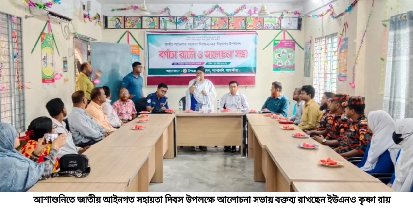 বিএম আলাউদ্দীন আশাশুনি প্রতিনিধি: আশাশুনিতে জাতীয় আইনগত সহায়তা দিবস-২০২৫ উপলক্ষে র‍্যালি ও আলোচনা সভা অনুষ্ঠিত হয়েছে। (২৮ এপ্রিল) সোমবার সকাল সাড়ে ৯টায় উপজেলা পরিষদ চত্বর থেকে একটি র‍্যালী বের করা হয়। র‍্যালীটি উপজেলার বিভিন্ন সড়ক প্রদক্ষিণ শেষে উপজেলা পরিষদ সম্মেলন কক্ষে এসে এক আলোচনা সভার আয়োজন করা হয়। উপজেলা নির্বাহী কর্মকর্তা কৃষ্ণা রায়ের সভাপতিত্বে উপস্থিত ছিলেন কৃষি কর্মকর্তা শুভ্রাংশু শেখর দাশ, ইন্সপেক্টর তদন্ত আব্দুল ওয়াদুদ, হিসাব রক্ষক কর্মকর্তা মমিন আহম্মেদ, বড়দল ইউপির প্রশাসক চেয়ারম্যান ও আইসিটি কর্মকর্তা আক্তার ফারুক বিল্লাল, মহিলা বিষয়ক কর্মকর্তা সাইদুল ইসলাম, ফায়ার সার্ভিস কর্মকর্তা আমজাদ আললী প্রমুখ। উপজেলার আইনগত সহায়তার বিভিন্ন বিষয়ে নিয়ে আলোচনা করা হয়।